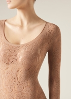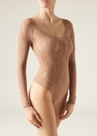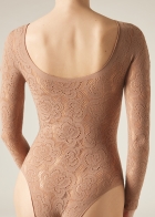 Боди из сетки с цветочным узором, напоминающим кружево макраме. Можно сочетать с колготками MODC2150. Элегантная модель с вырезом лодочкой и длинными рукавами. Нижняя часть в форме слипов застегивается на крючки, обеспечивая практичность и комфорт. Идеальная модель, чтобы создать эффектный образ для особого случая.