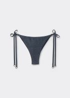 Низ купальника бразильяно на завязках, регулирующих посадку изделия. Мягкая ткань с легким блеском и изысканным принтом «питон» тон в тон. Слегка закругленная спереди линия талии позволяет регулировать посадку в зависимости от особенностей фигуры — низ купальника можно носить классическим способом или поднимать вырез бедра.