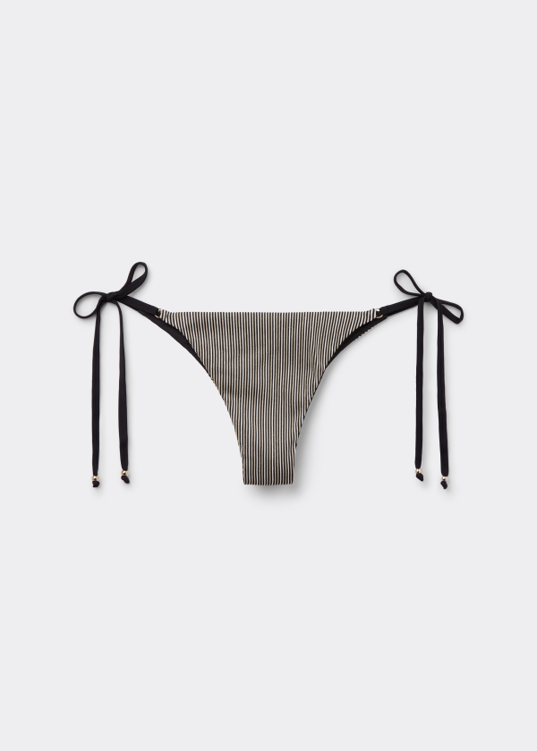Низ купальника в форме бразильяно. Тонкие завязки на бедрах позволяют регулировать посадку изделия. Золотистый фон ткани придает этой модели в полоску изысканность и легкий блеск. Слегка закругленная спереди линия талии позволяет регулировать посадку в зависимости от особенностей фигуры — низ купальника можно носить классическим способом или поднимать вырез бедра. Сплошная подкладка с невидимыми швами.
