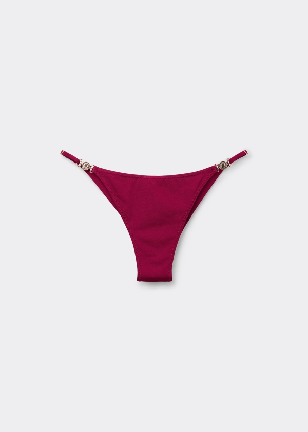 Бикини бразильяно с регулируемыми тесемками по бокам. Минималистичная модель подчеркивает силуэт, внося в образ изысканные чувственные нотки. Слегка закругленная спереди линия талии позволяет регулировать посадку в зависимости от особенностей фигуры — низ купальника можно носить классическим способом или поднимать вырез бедра. Блестящую ткань с эффектом шелка дополняют элегантные золотистые детали, вызывая ощущение сдержанной роскоши. Сплошная подкладка с невидимыми швами.
