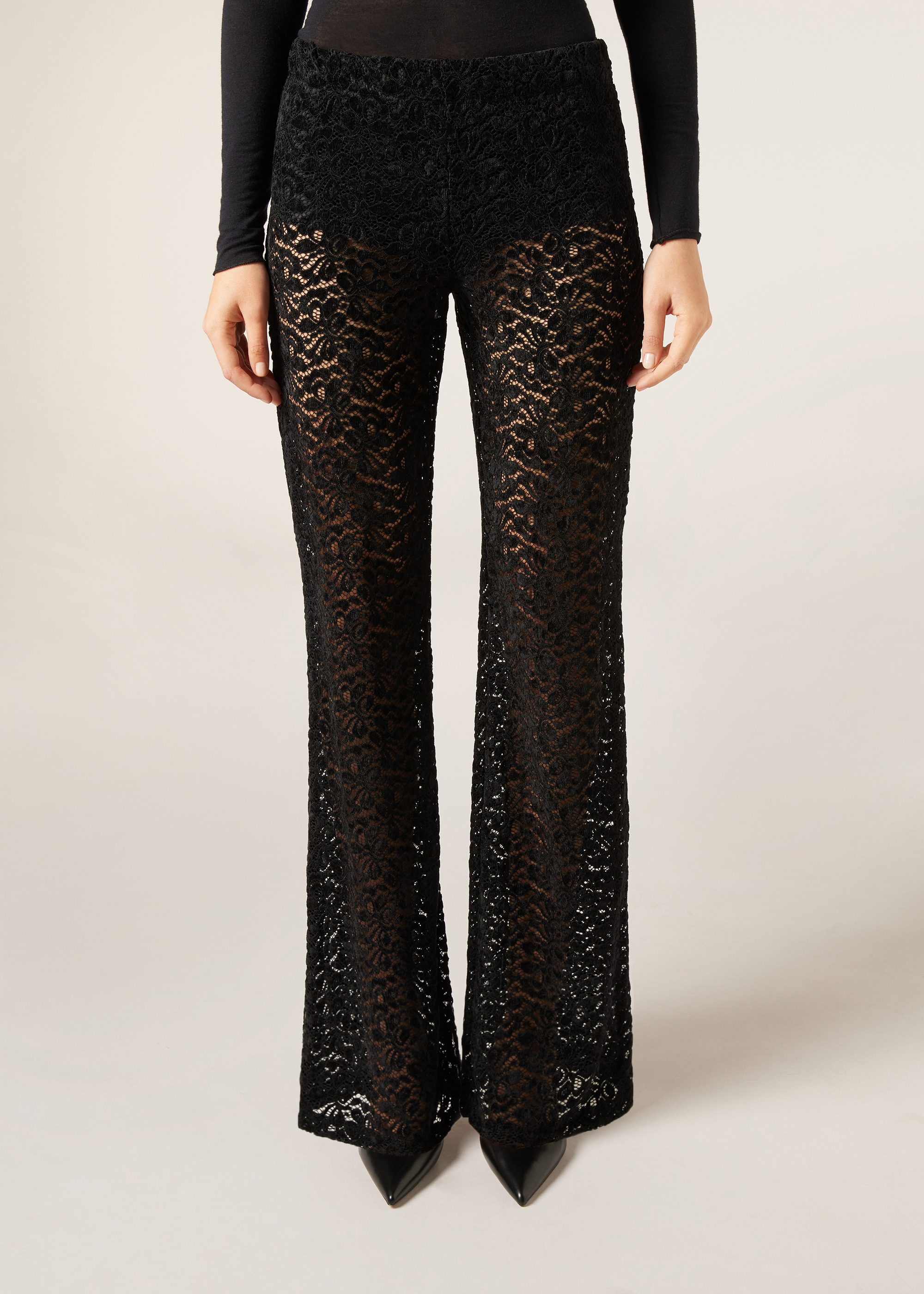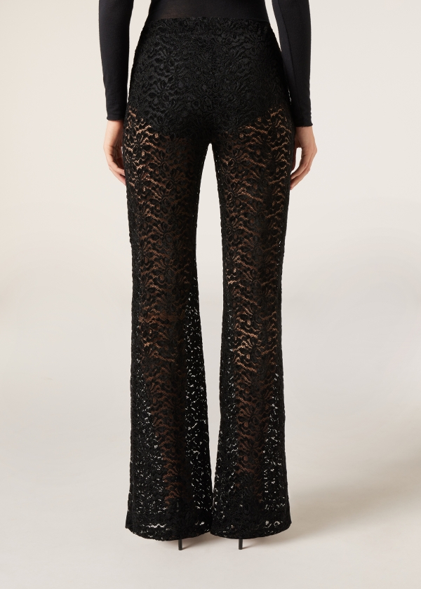 Изысканные брюки клеш из элегантного кружева с эффектом бархата. Пояс из мягкой резинки обеспечивает комфортную посадку. Внутренние шортики из блестящей непрозрачной ткани подчеркивают оригинальный дизайн.