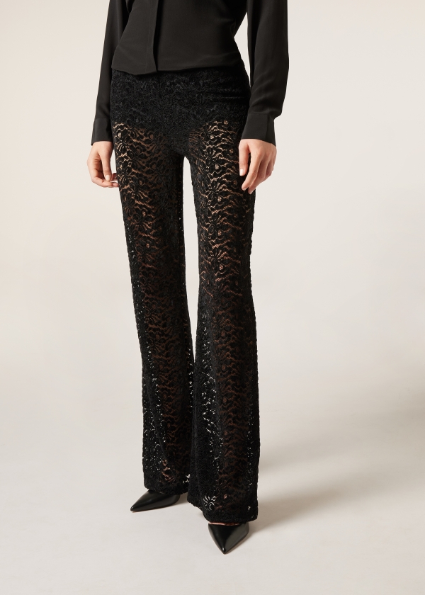 Изысканные брюки клеш из элегантного кружева с эффектом бархата. Пояс из мягкой резинки обеспечивает комфортную посадку. Внутренние шортики из блестящей непрозрачной ткани подчеркивают оригинальный дизайн.