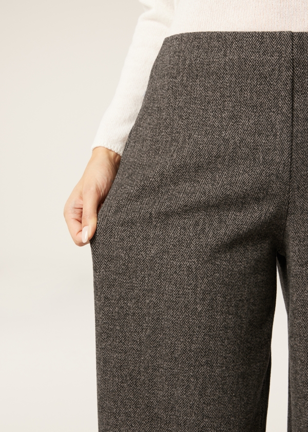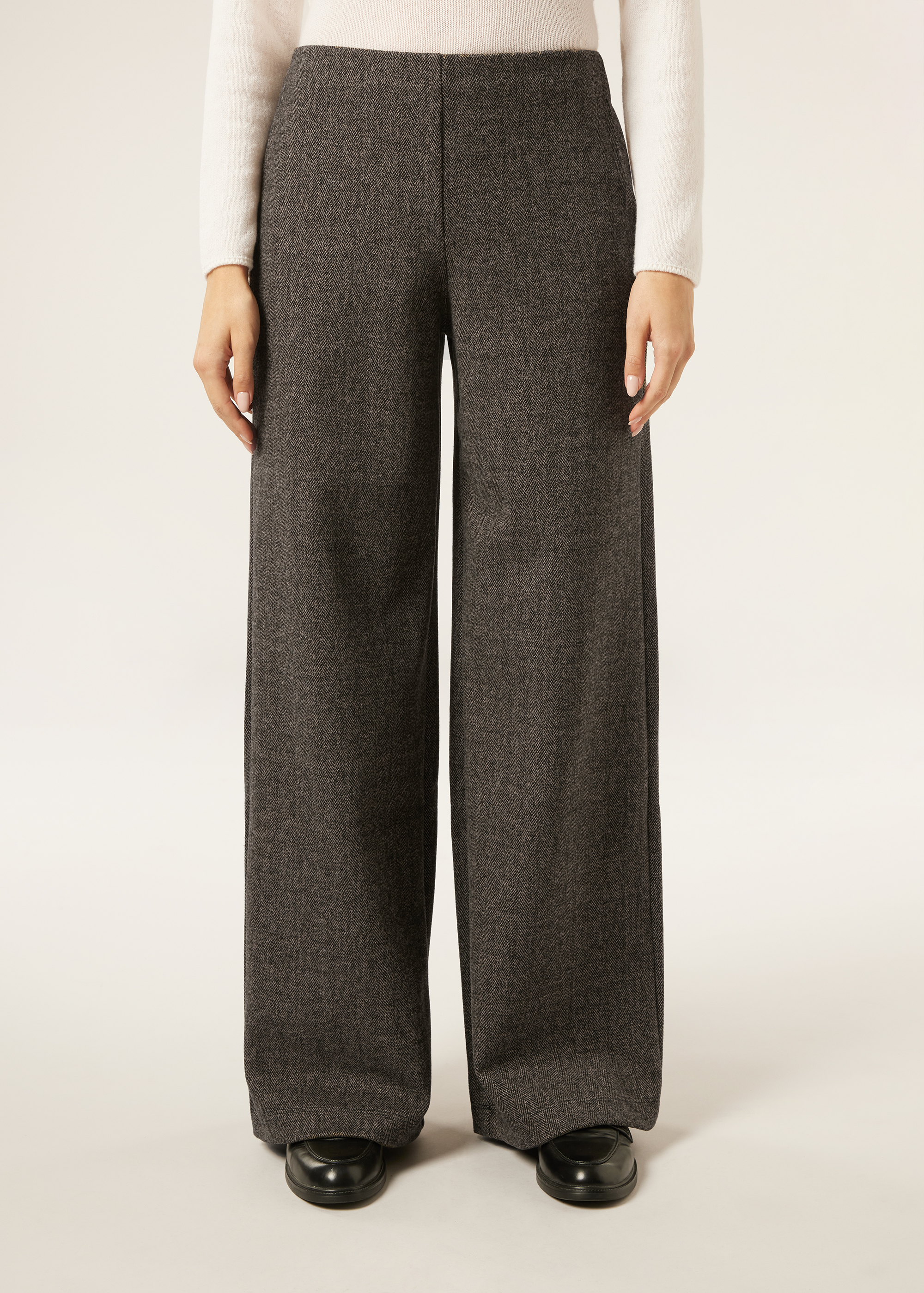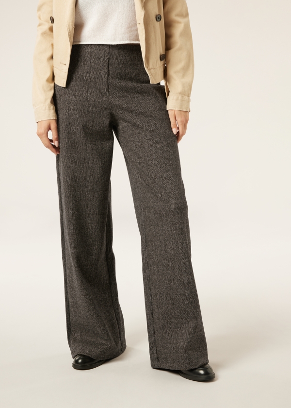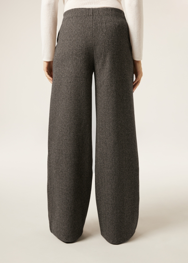 Брюки палаццо из мягкой и приятной ткани с элегантным узором «елочка». Гладкий пояс с особой отделкой, обеспечивающей надежную фиксацию, и эластичная вставка сзади гарантируют безупречную посадку, гармонично сочетая комфорт и стиль.