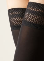 Женские плотные чулки с эффектом Soft Touch. Очень комфортная и мягкая модель. Плотность 50 ден. Плоская кайма с ажурным узором и силиконовым покрытием позволяет носить эти чулки даже под самой облегающей одеждой.