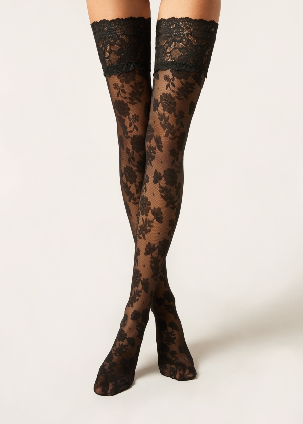 Чулки из тюля в горошек с цветочным узором. Плотность 40 ден. Изысканная кружевная кайма на силиконовой основе придает образу женственные нотки.