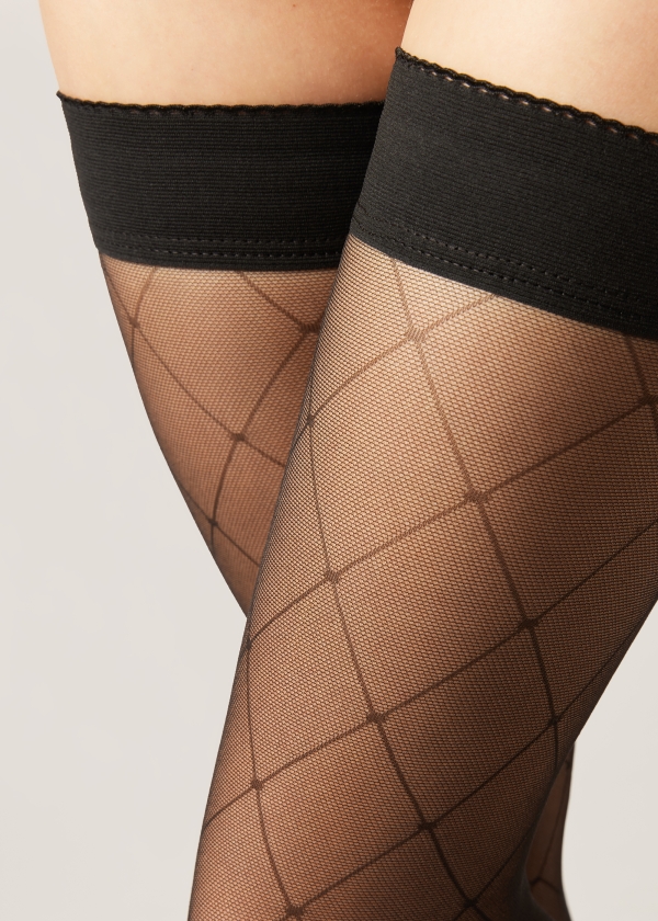 Сетчатые чулки в ромбик, с каймой на силиконовой основе. Плотность 50 ден. Гармоничное сочетание женственности и графического дизайна.