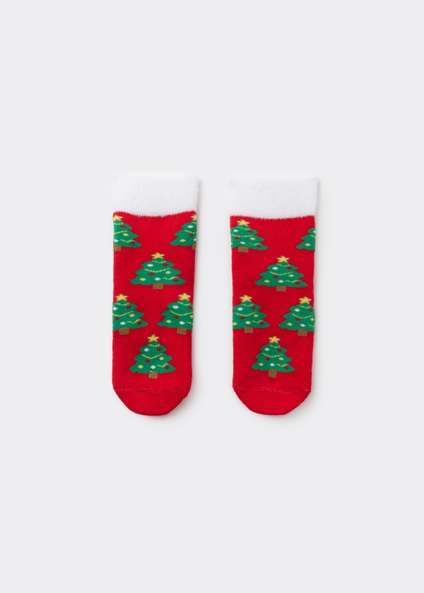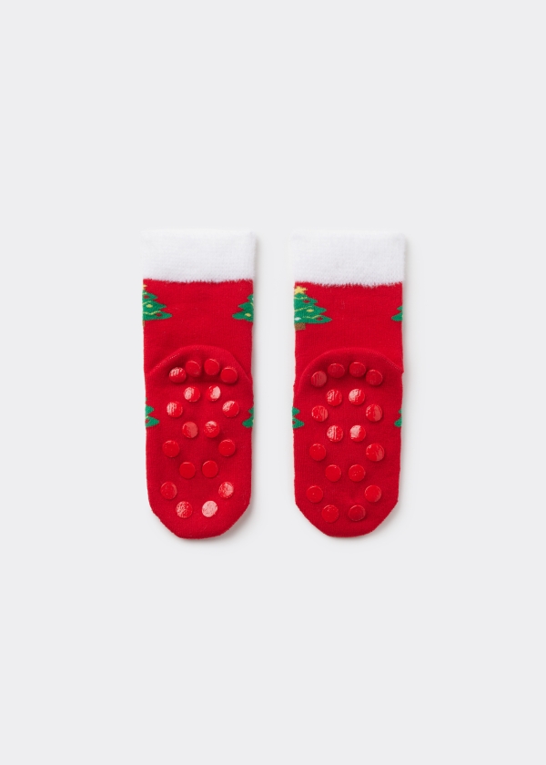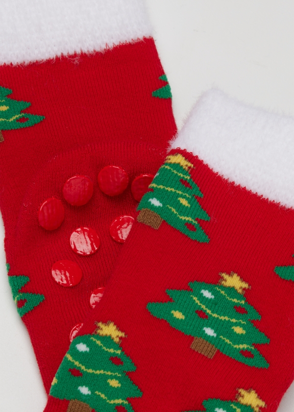 Детские нескользящие носки из хлопка с новогодним принтом. Благодаря противоскользящему покрытию в зоне стопы, которое обеспечивает устойчивость и хорошее сцепление с полом, эта комфортная модель идеально подходит для дома.