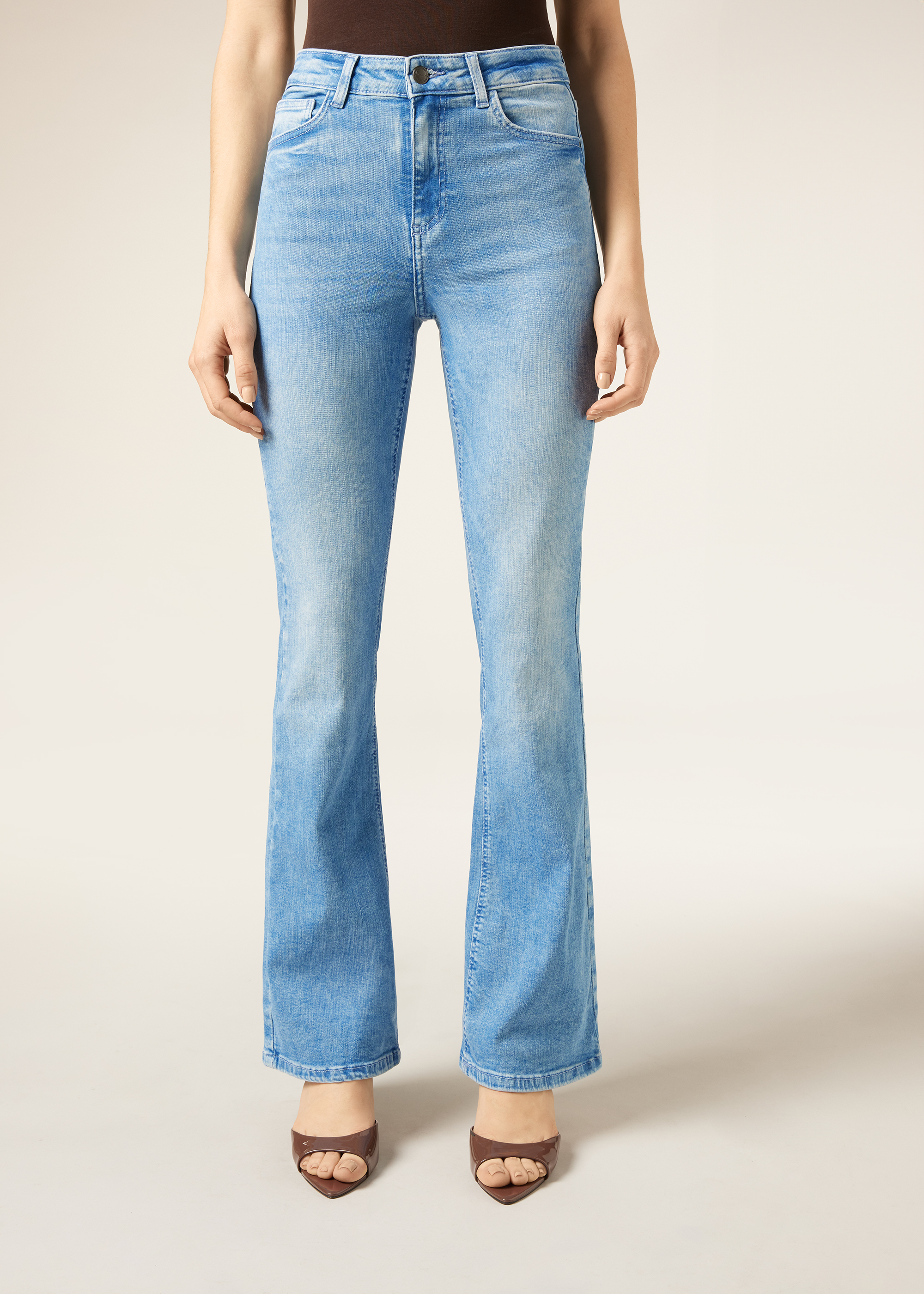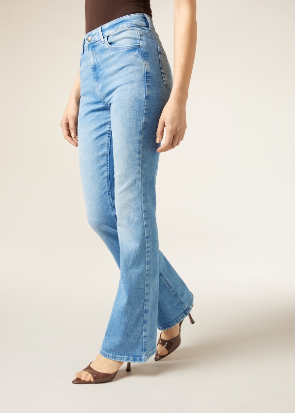 Женские джинсы клеш с пятью карманами, шлевками на поясе, застежкой-молнией, пуговицей и заклепками, украшенными логотипом Clz. Стильные и удобные джинсы клеш из очень эластичной ткани обеспечивают исключительный комфорт и идеальную посадку.