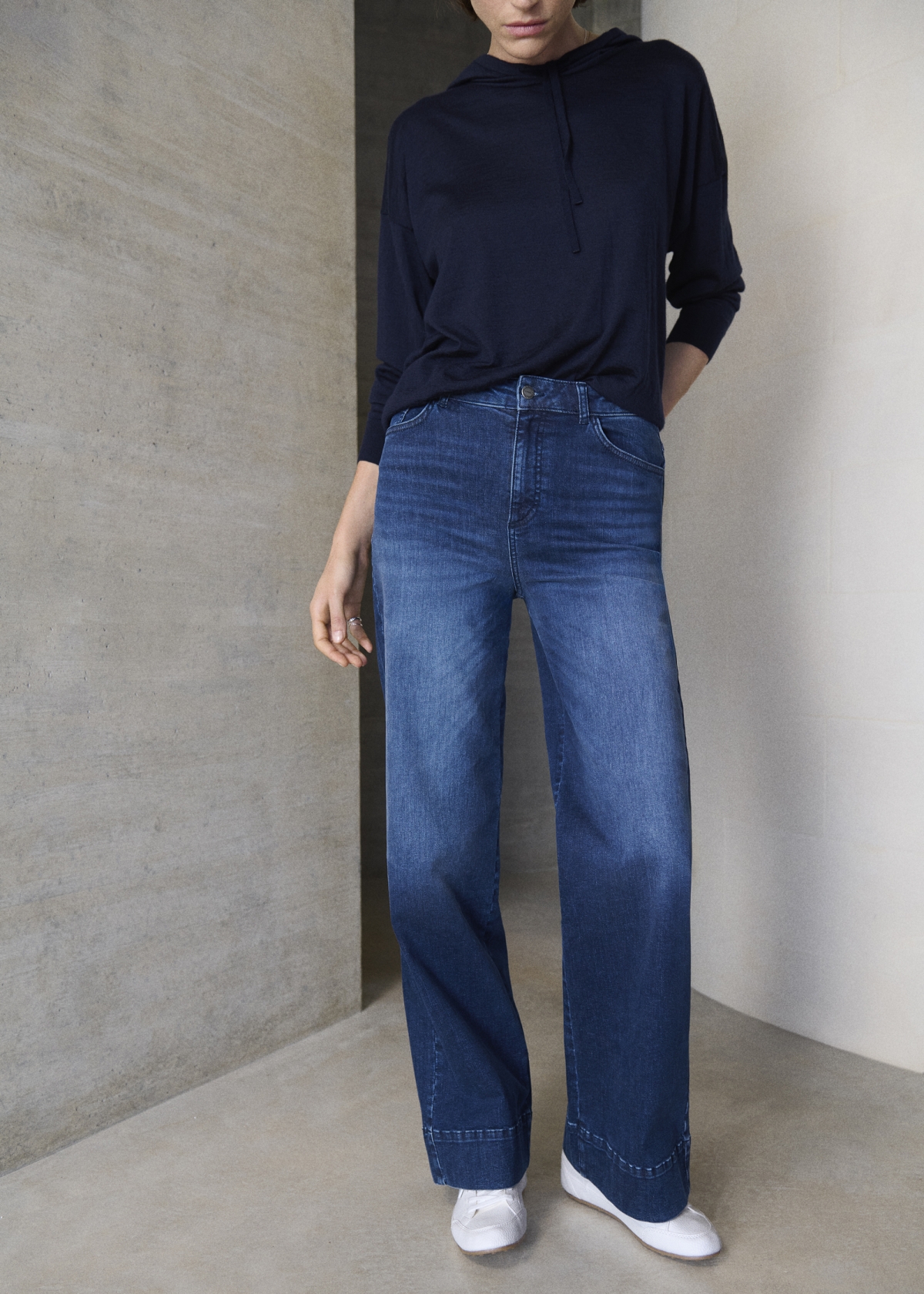 Женские джинсы клеш с пятью карманами, шлевками на поясе, застежкой-молнией, пуговицей и заклепками, украшенными логотипом Clz. Стильные и удобные джинсы клеш из очень эластичной ткани обеспечивают исключительный комфорт и идеальную посадку.