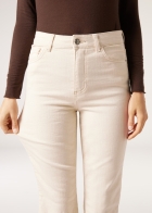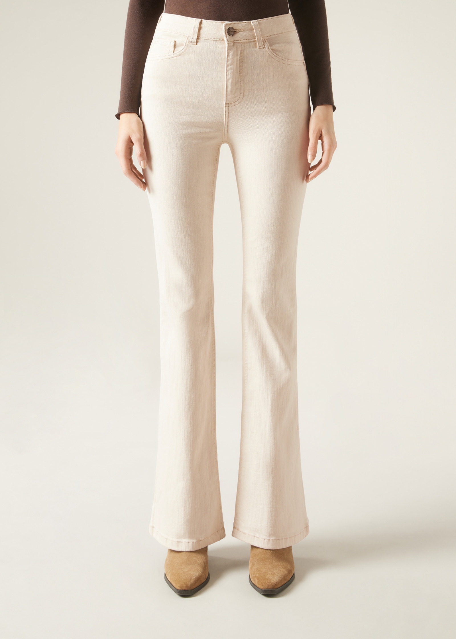 Женские джинсы клеш с пятью карманами, шлевками на поясе, застежкой-молнией, пуговицей и заклепками, украшенными логотипом Clz. Стильные и удобные джинсы клеш из очень эластичной ткани обеспечивают исключительный комфорт и идеальную посадку.