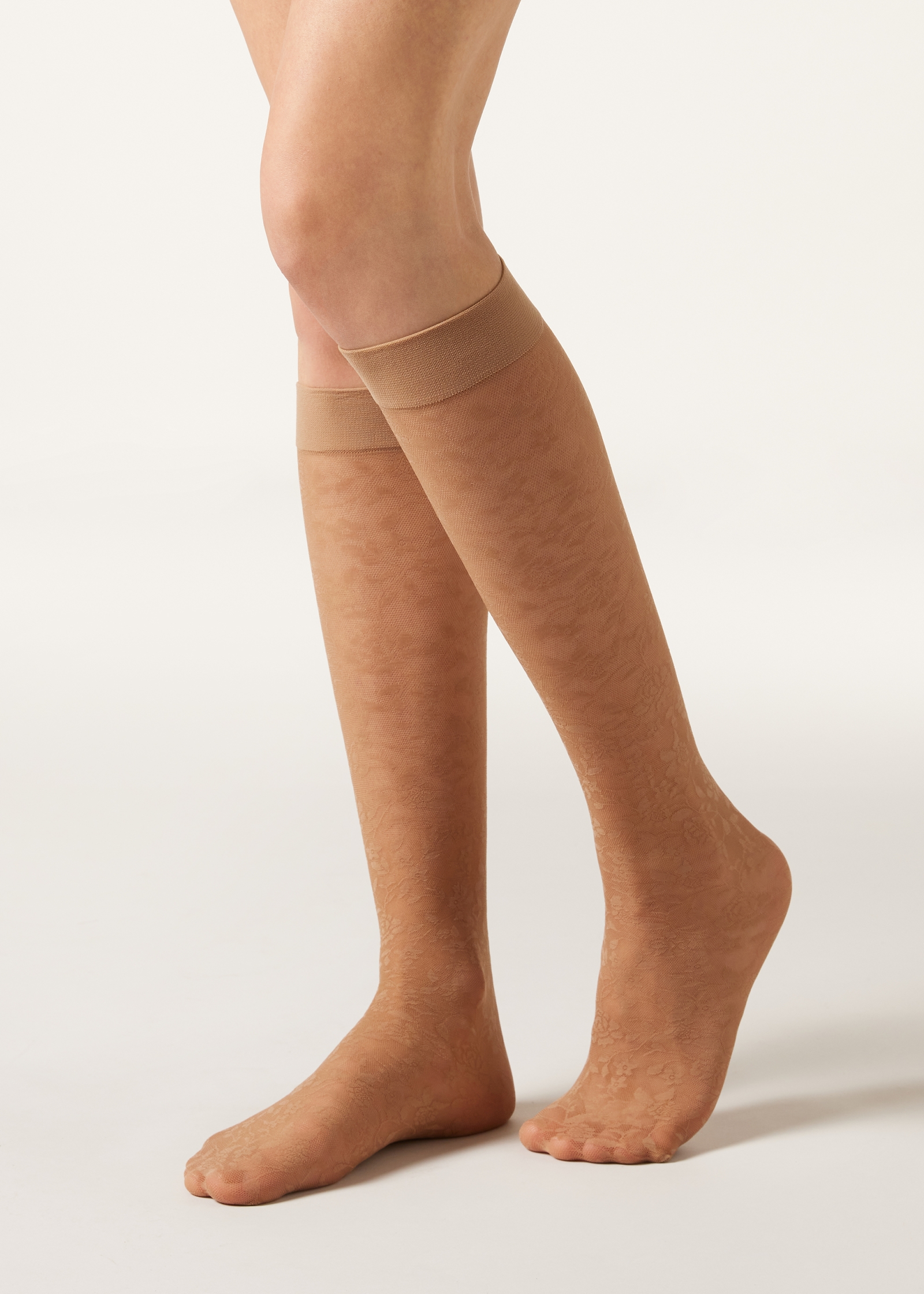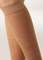 Женские гольфы из тюля с кружевным цветочным узором. Плотность 50 ден. Гладкий бортик.