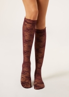 Женские кружевные гольфы со швом сзади. Мягкий волнистый бортик дополняет атласный бантик. Изысканная и женственная модель с намеком на высокую моду.