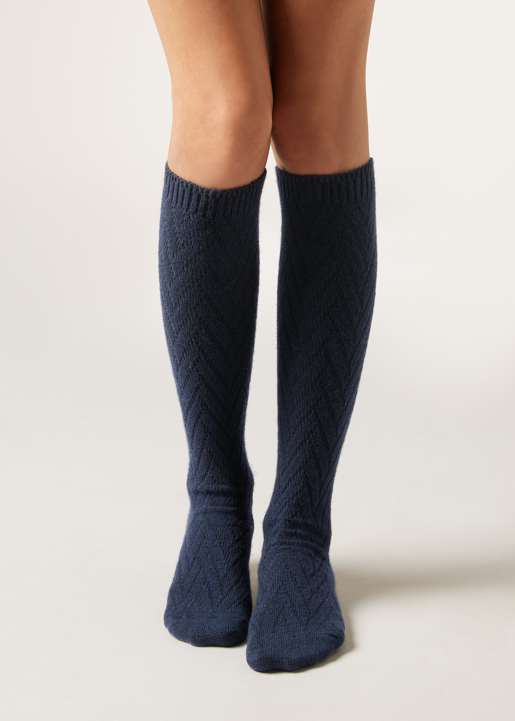 Плотные женские гольфы из теплой смесовой пряжи с кашемиром. Фактурная модель с узором «шеврон». Эти мягкие и облегающие гольфы, сочетающие в себе стиль и комфорт, согреют вас в холодную погоду.