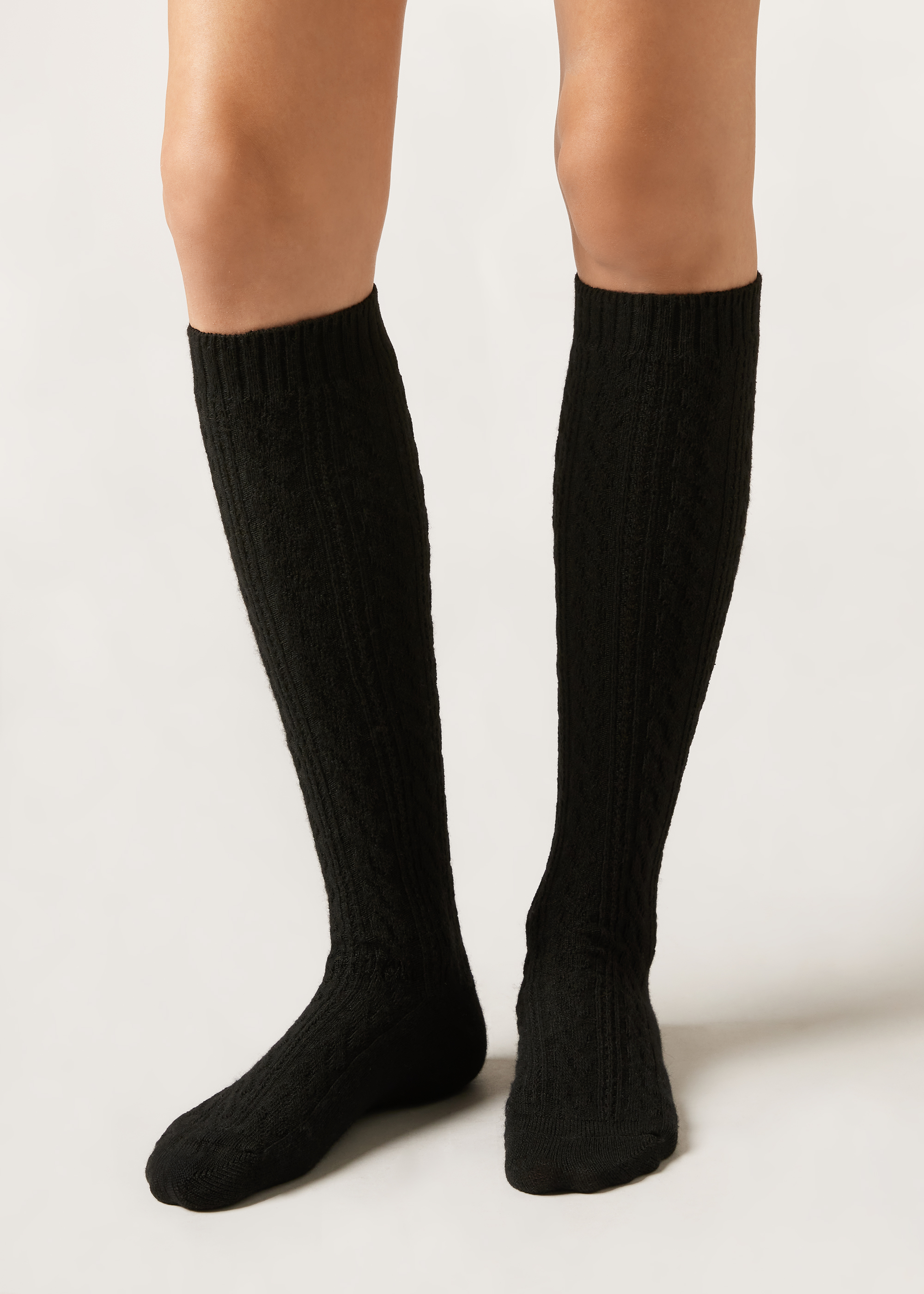 Плотные женские гольфы из теплой смесовой пряжи с кашемиром. Фактурная модель с узором «косичка». Эти мягкие и облегающие гольфы, сочетающие в себе стиль и комфорт, согреют вас в холодную погоду.