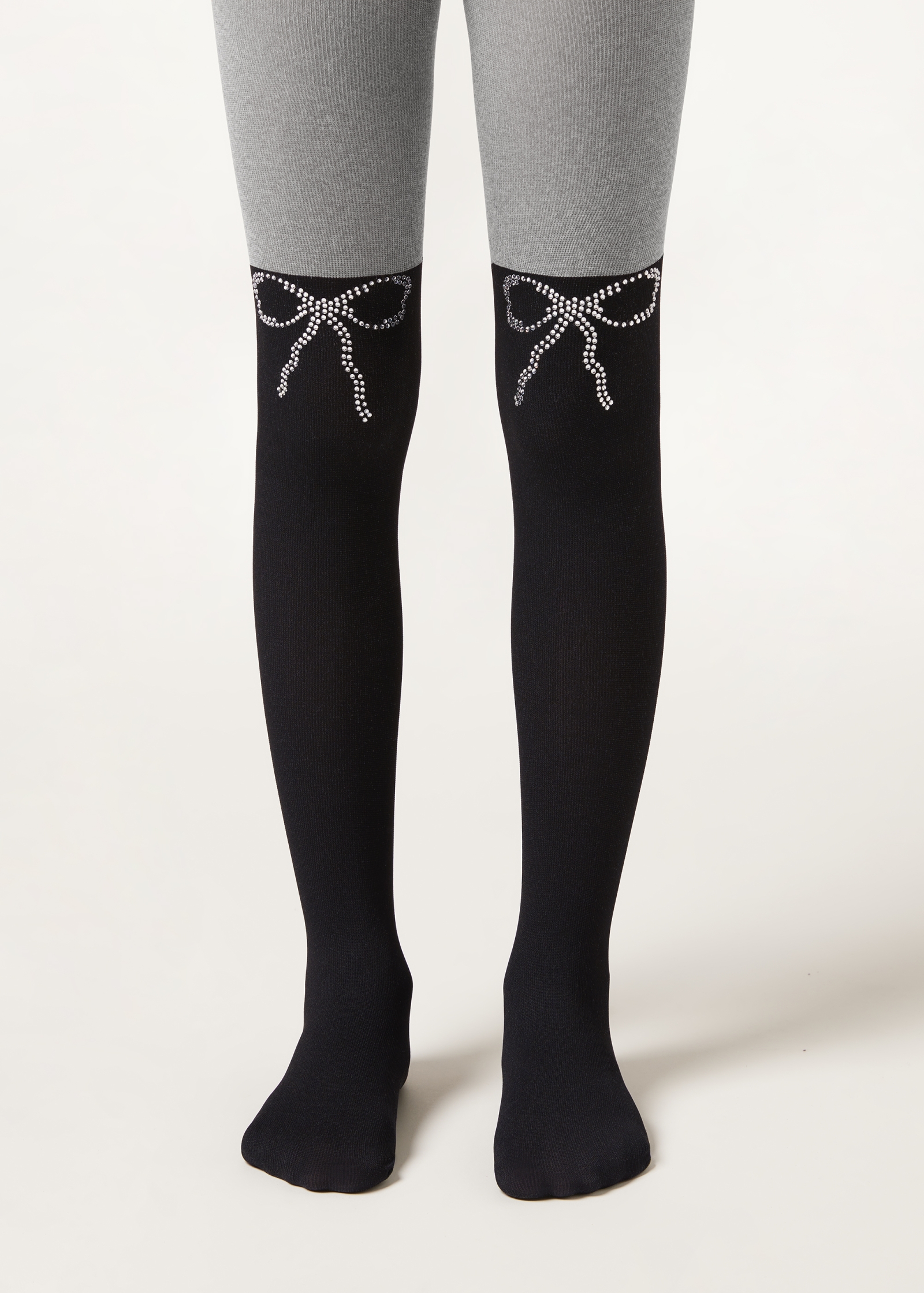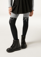 Меланжевые колготки с эффектом гольфин для девочек. Модель из микрофибры украшена аппликацией в виде бантика из страз. Плотность 80 ден. Эти мягкие и плотные колготки идеально подходят для создания элегантных образов.