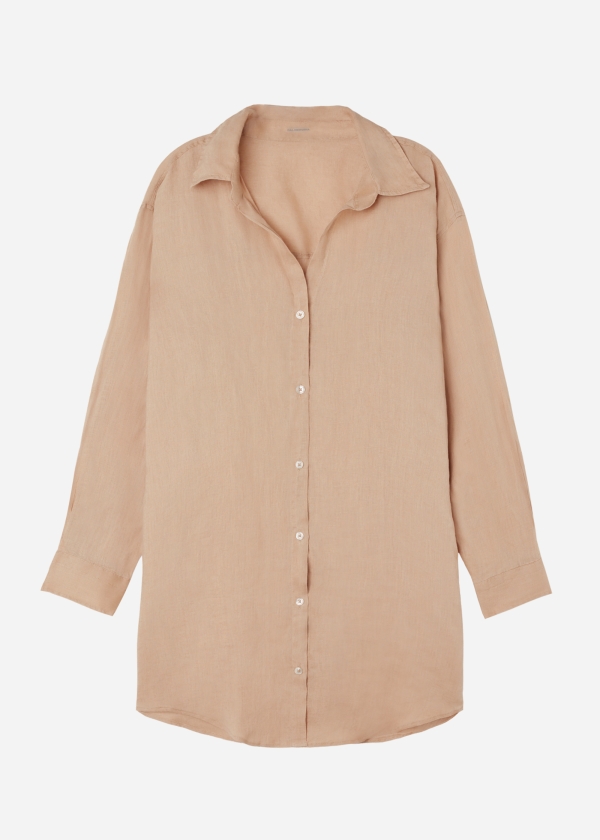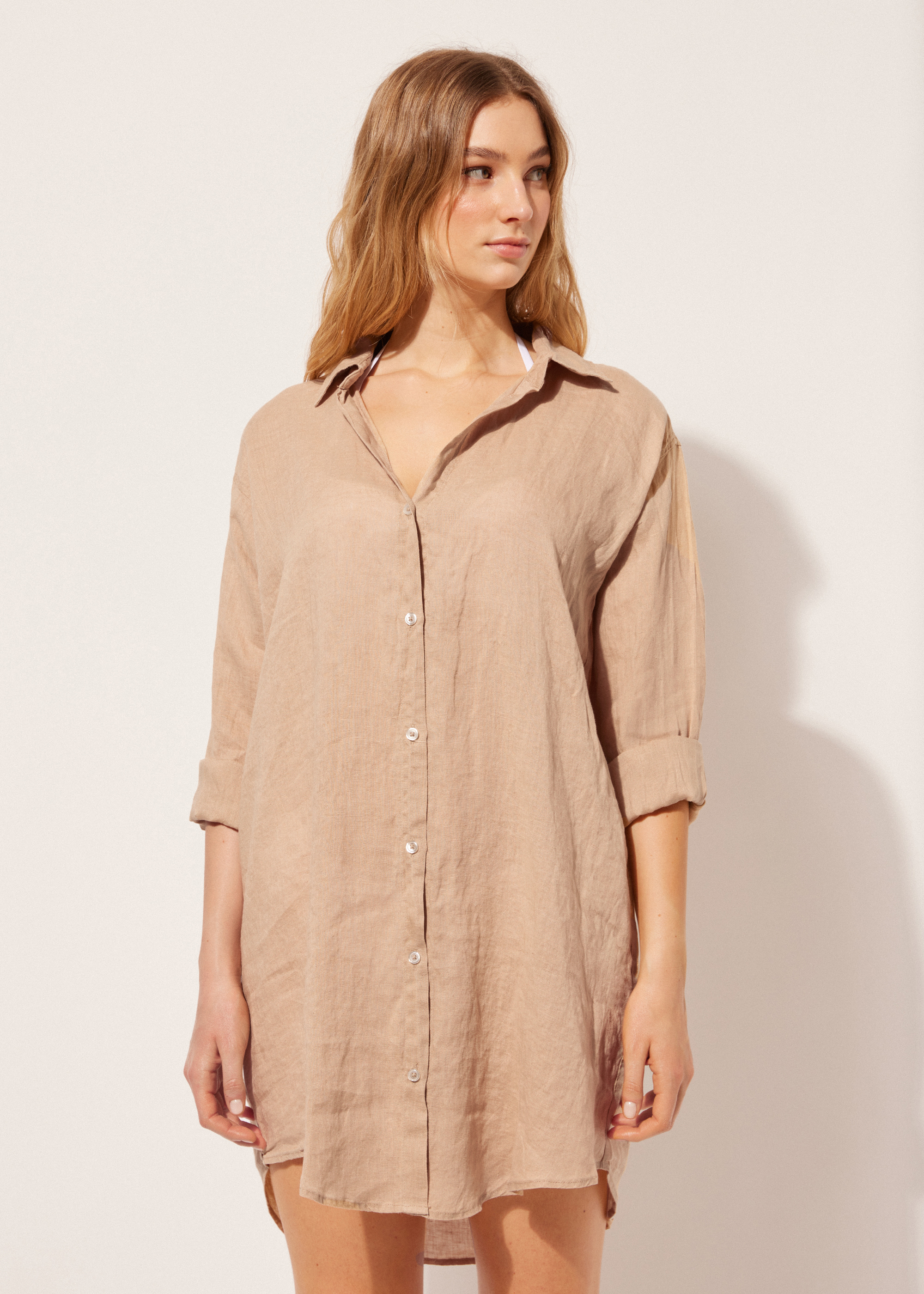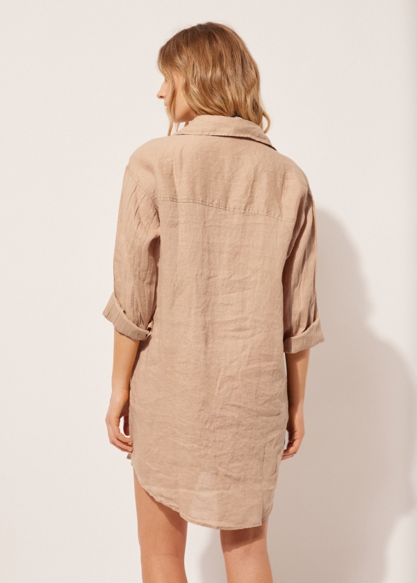 Платье-рубашка изо льна — идеальная одежда для тех, кто любит натуральные материалы. Модель с отложным воротником, длинными рукавами и пуговичной застежкой. Длина выше колена.