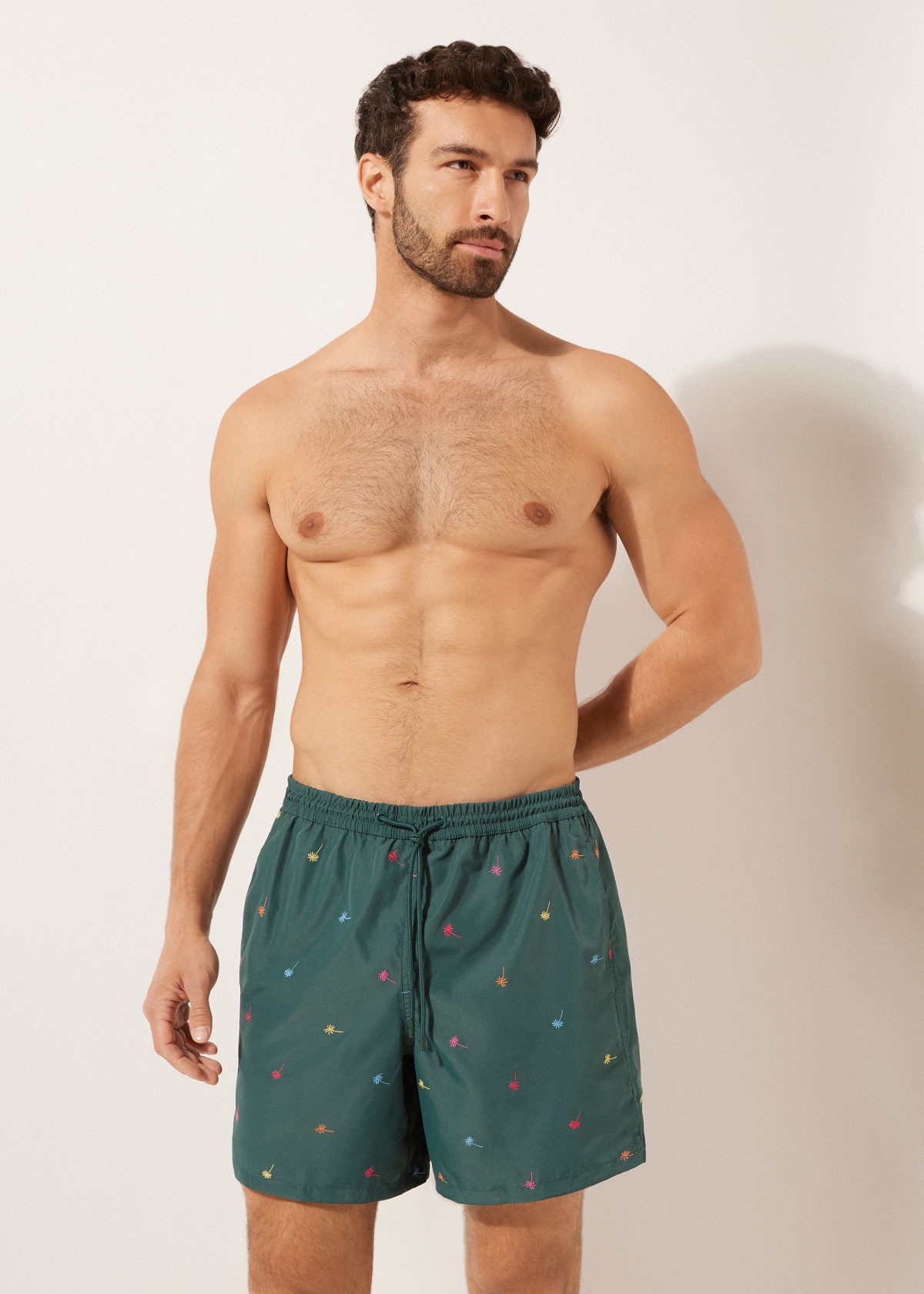 Мужские плавки-шорты с эластичным поясом. На талии кулиска с цветным эглетом на шнурке. Длина до середины бедра. По бокам прорезные карманы из сетчатой ткани. Сзади накладной карман с логотипом. Мягкая и комфортная быстросохнущая ткань.