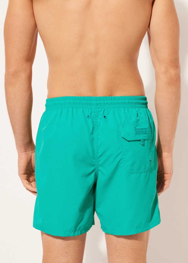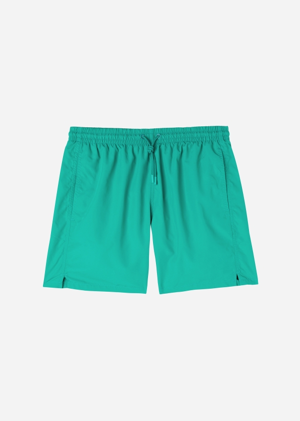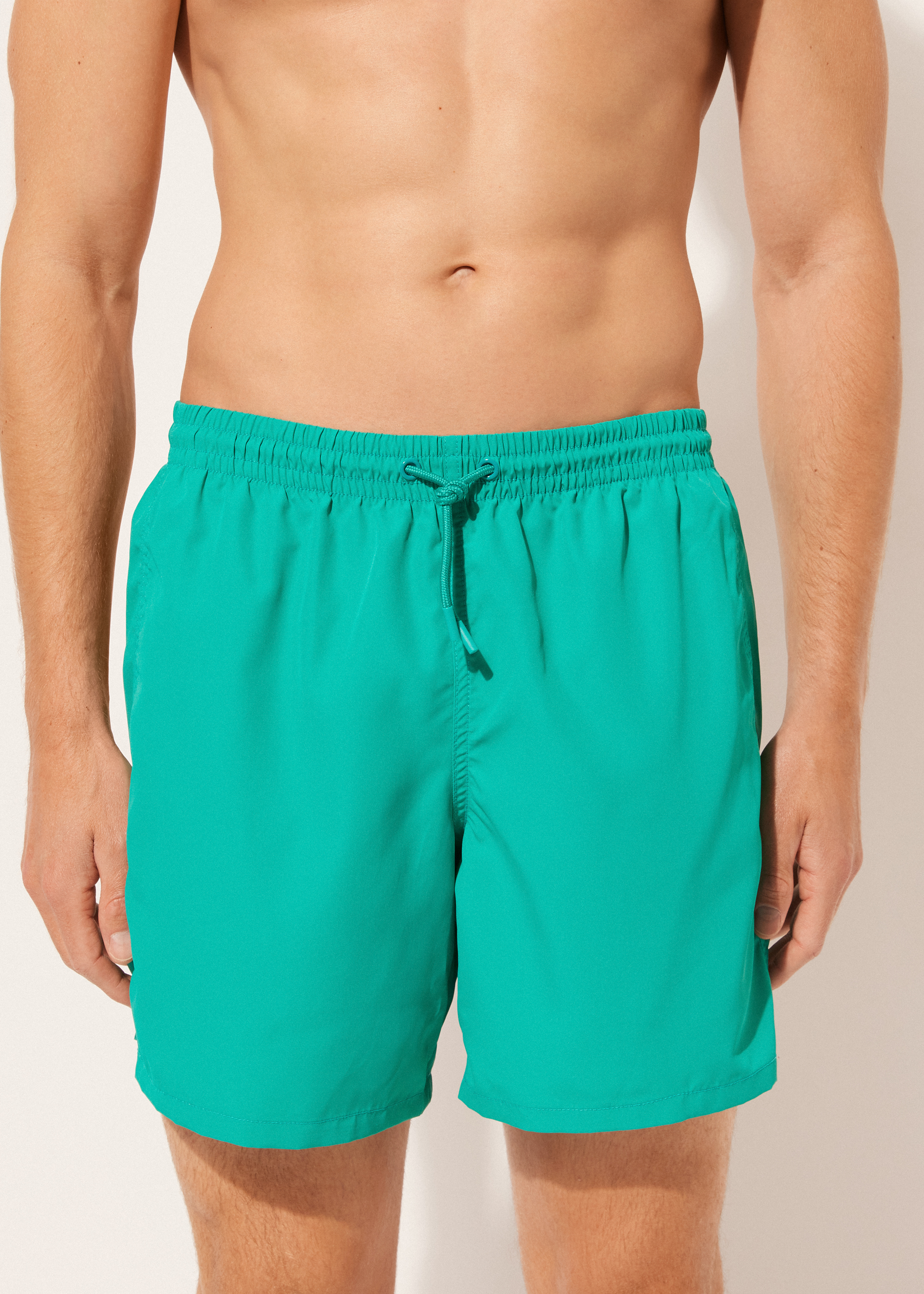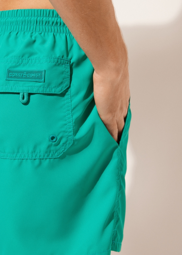 Мужские плавки-шорты с эластичным поясом. На талии кулиска с цветным эглетом на шнурке. Длина до середины бедра. По бокам прорезные карманы из сетчатой ткани. Сзади накладной карман с логотипом. Мягкая и комфортная быстросохнущая ткань.