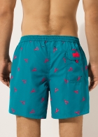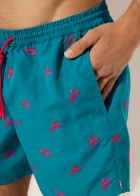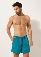 Мужские плавки-шорты из ткани. Пояс с резинкой внутри. Кулиска с контрастным шнурком и цветным эглетом. Ткань с ярким сплошным принтом. Длина до середины бедра. Боковые карманы. Внутри сетка. Сзади накладной карман.