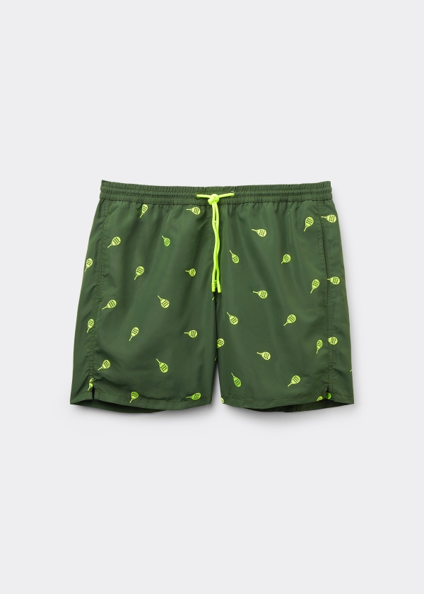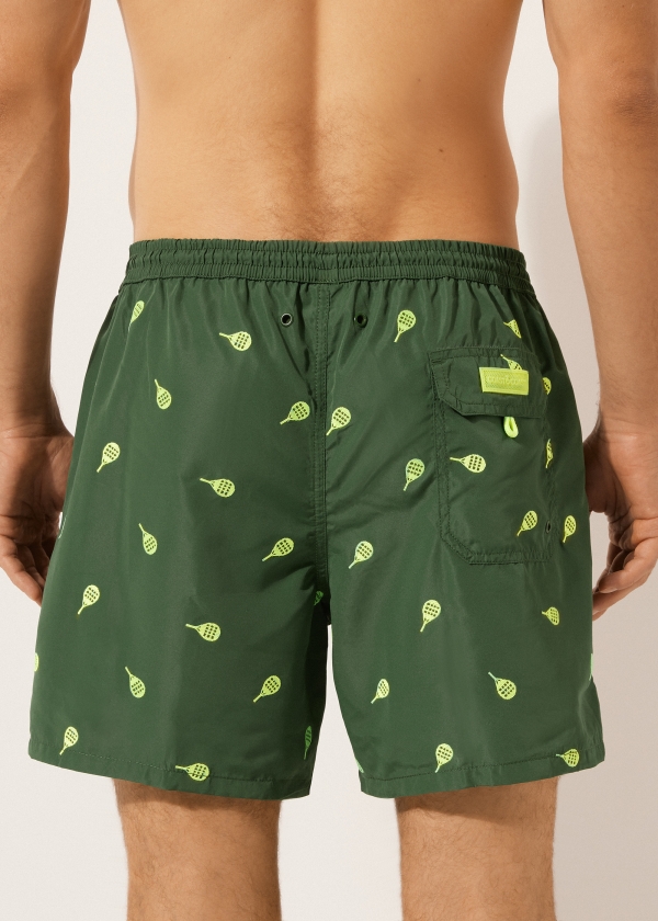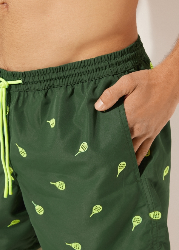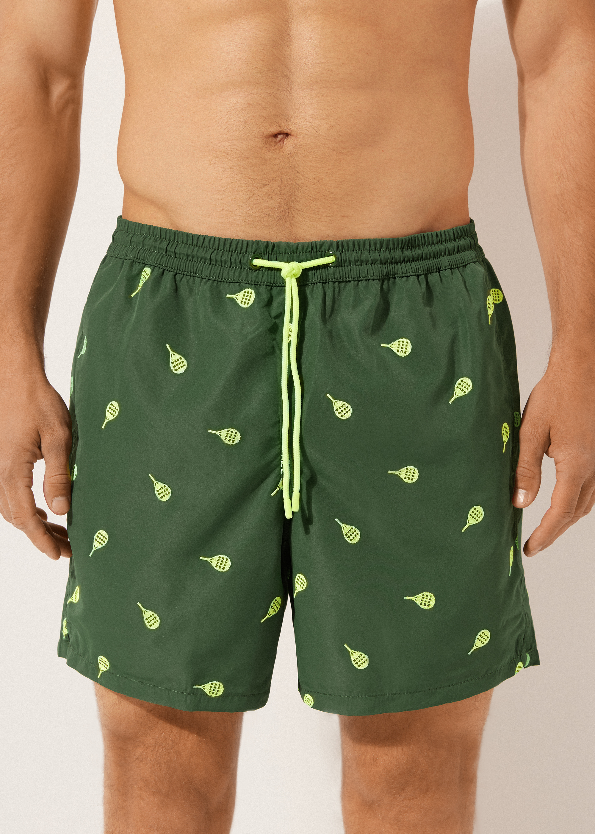 Мужские плавки-шорты из ткани. Пояс с резинкой внутри. Кулиска с контрастным шнурком и цветным эглетом. Ткань с ярким сплошным принтом. Длина до середины бедра. Боковые карманы. Внутри сетка. Сзади накладной карман.