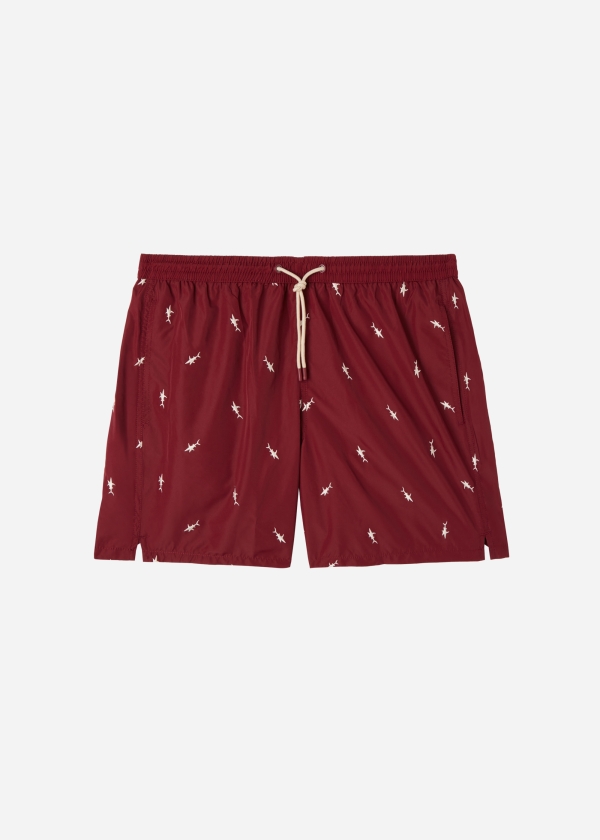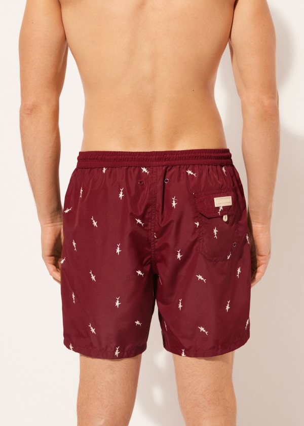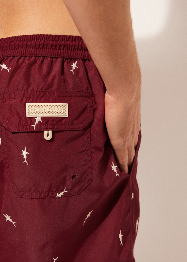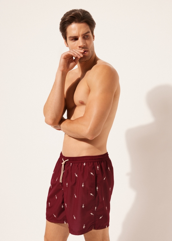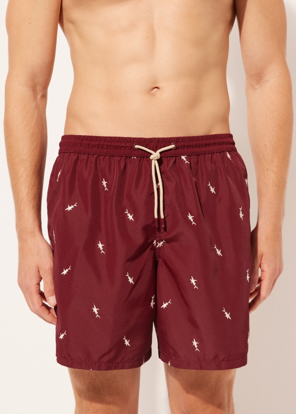 Мужские плавки-шорты из ткани. Пояс с резинкой внутри. Кулиска с контрастным шнурком и цветным эглетом. Ткань с ярким сплошным принтом. Длина до середины бедра. Боковые карманы. Внутри сетка. Сзади накладной карман.