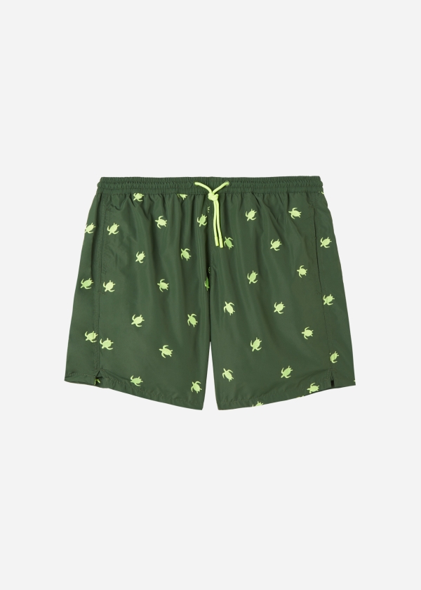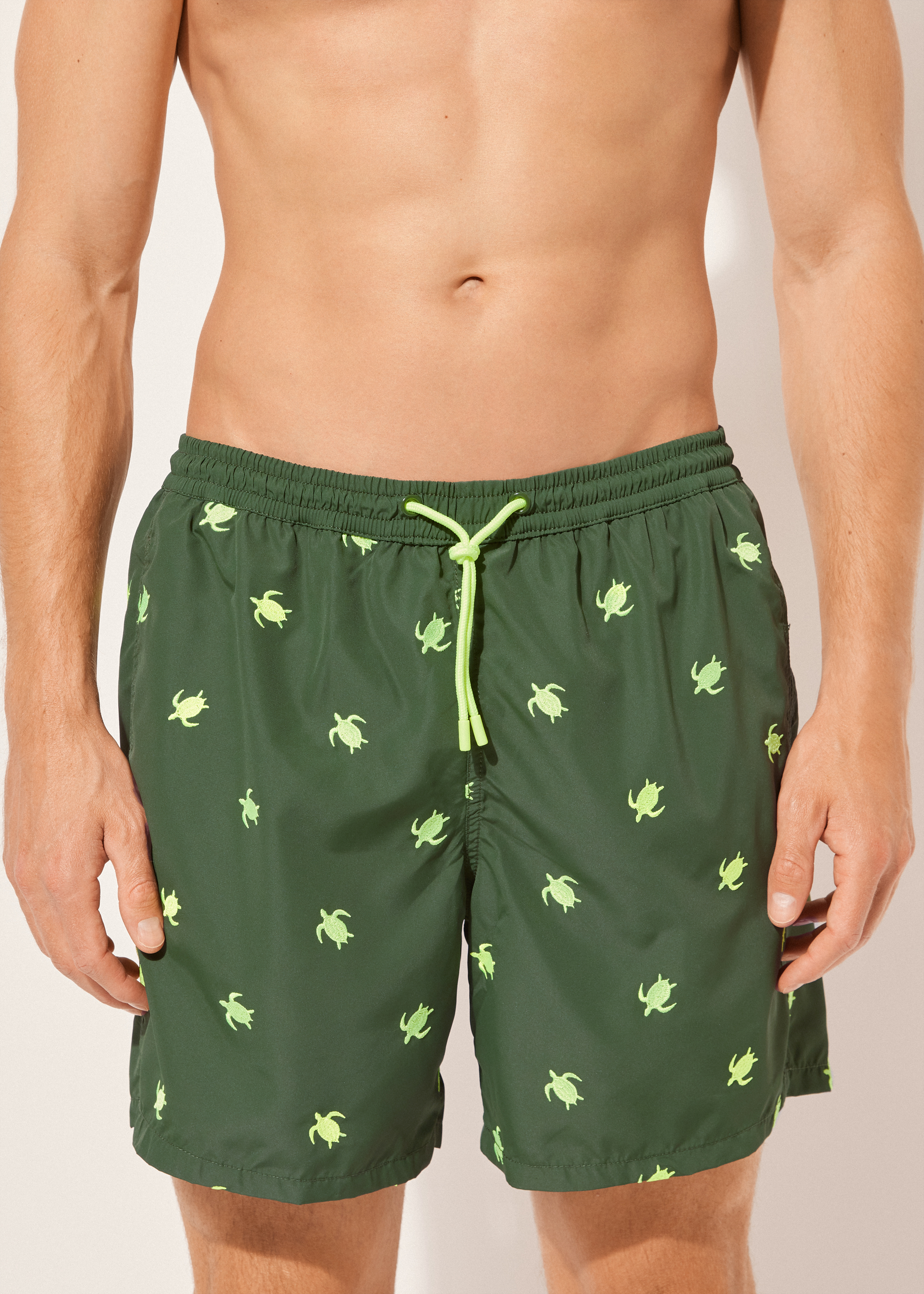 Мужские плавки-шорты из ткани. Пояс с резинкой внутри. Кулиска с контрастным шнурком и цветным эглетом. Ткань с ярким сплошным принтом. Длина до середины бедра. Боковые карманы. Внутри сетка. Сзади накладной карман.