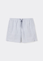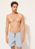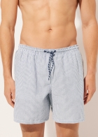 Мужские плавки-шорты. Присборенный пояс-кулиска с резинкой внутри, регулируемый двухцветным шнурком с наружной стороны. Стандартная посадка. Длина выше колена. По бокам прорезные карманы. Внутри сетка. Сзади накладной карман с клапаном на текстильной застежке. Хлопковая ткань сирсакер, окрашенная в пряже, с жатой фактурой и полосатым рисунком. Подкладка в форме трусов-слипов из мягкой непрозрачной ткани. Различные цвета в ассортименте.