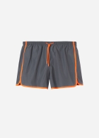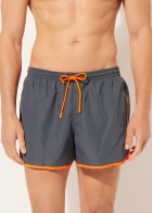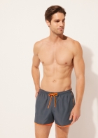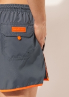 Мужские плавки-шорты с лампасами контрастного цвета. Эластичный пояс-кулиска с цветным шнурком. Боковые карманы из сетчатой ткани. Сзади карман с рельефным логотипом. Благодаря своему дизайну эта модель напоминает спортивные шорты для бега. Мягкая и комфортная быстросохнущая ткань.