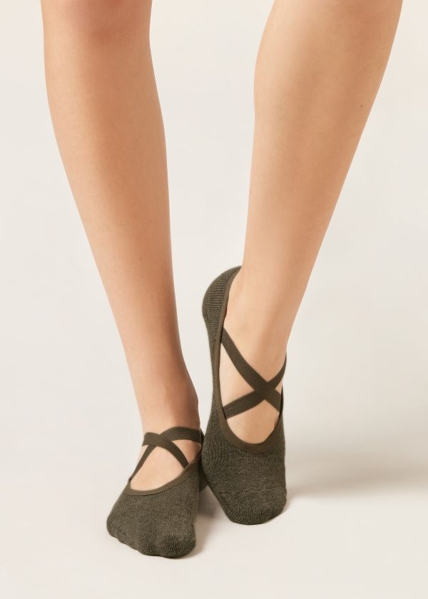 Женские нескользящие носки для пилатеса, выполненные из мягкого хлопка. Элегантные перекрещенные тесемки на подъеме. Противоскользящее покрытие на подошве для устойчивости во время занятий.