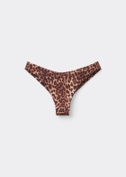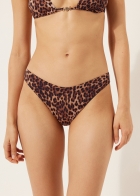 Бикини бразильяно полностью на подкладке. Ткань с элегантным тропическим принтом. Слегка закругленная спереди линия талии позволяет регулировать посадку в зависимости от особенностей фигуры — низ купальника можно носить классическим способом или поднимать вырез бедра.