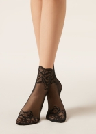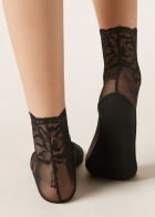 Женские короткие носки из тюля. В области пальцев и щиколотки изысканная кружевная кайма с цветочным узором. Элегантный дизайн и комфортная хлопковая подошва делают эти носки идеальным аксессуаром для завершения женственного образа.