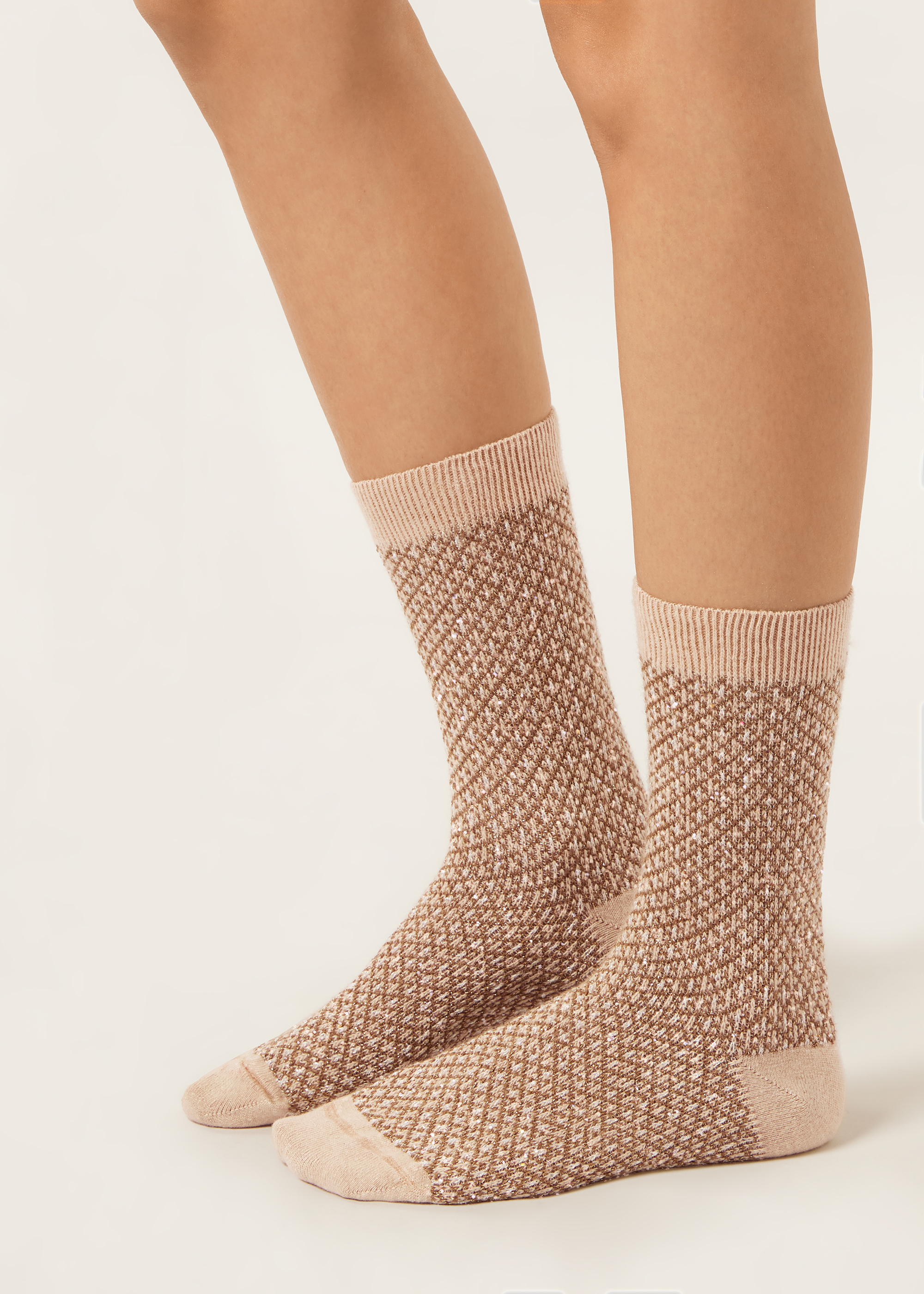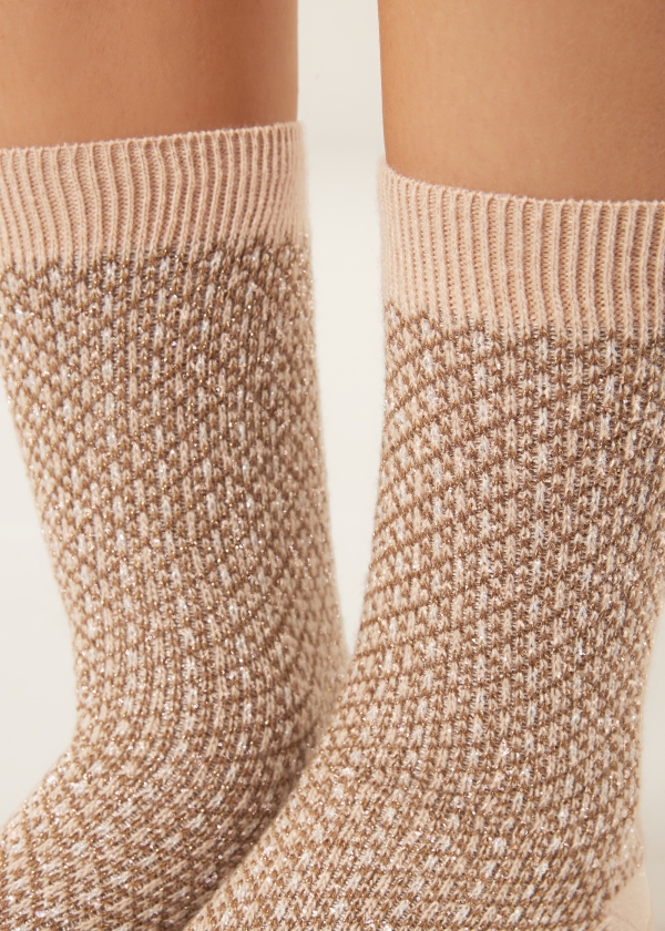 Женские короткие носки из плотной и теплой пряжи с кашемиром. Комфортная модель, украшенная мерцающими блестками.