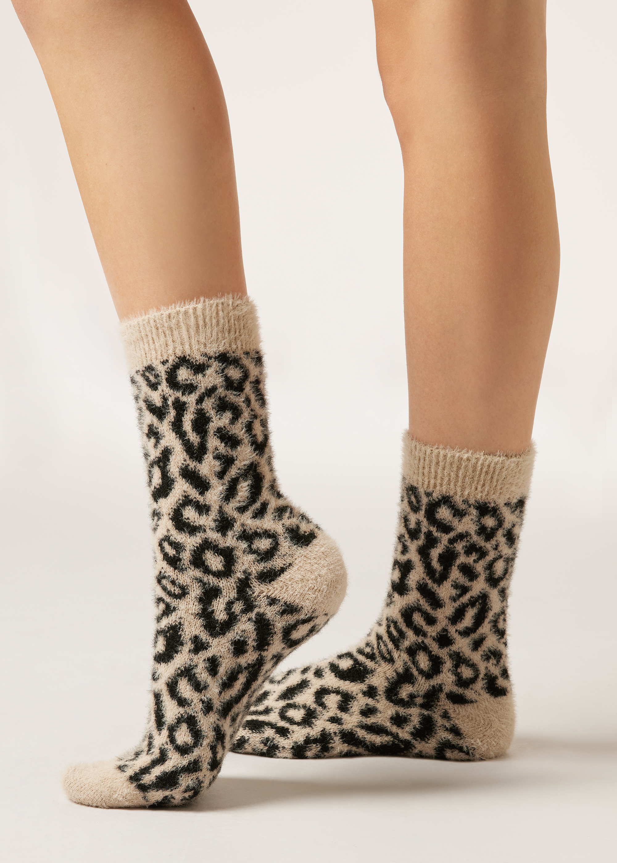 Женские короткие носки из невероятно мягкой на ощупь, теплой и плотной пряжи с изысканным эффектом меха. Эта стильная модель с модным анималистическим рисунком придаст дерзкую нотку зимнему образу.