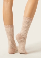 Женские короткие носки из плотной и теплой пряжи с кашемиром. Облегающая модель в рубчик. Благодаря блесткам, придающим изделию изысканный эффект мерцания, эти носки — идеальный гламурный акцент для зимних образов.
