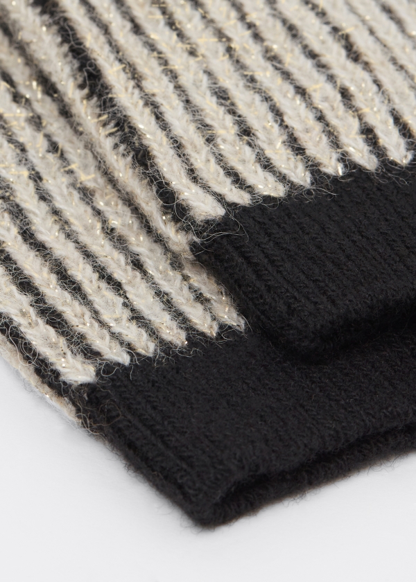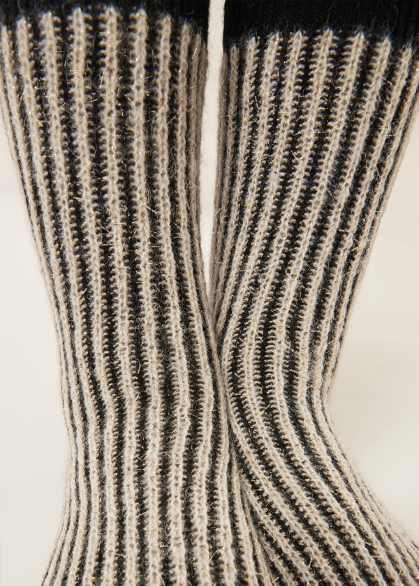 Женские короткие носки из плотной и теплой пряжи с кашемиром. Облегающая модель в рубчик. Благодаря блесткам, придающим изделию изысканный эффект мерцания, эти носки — идеальный гламурный акцент для зимних образов.