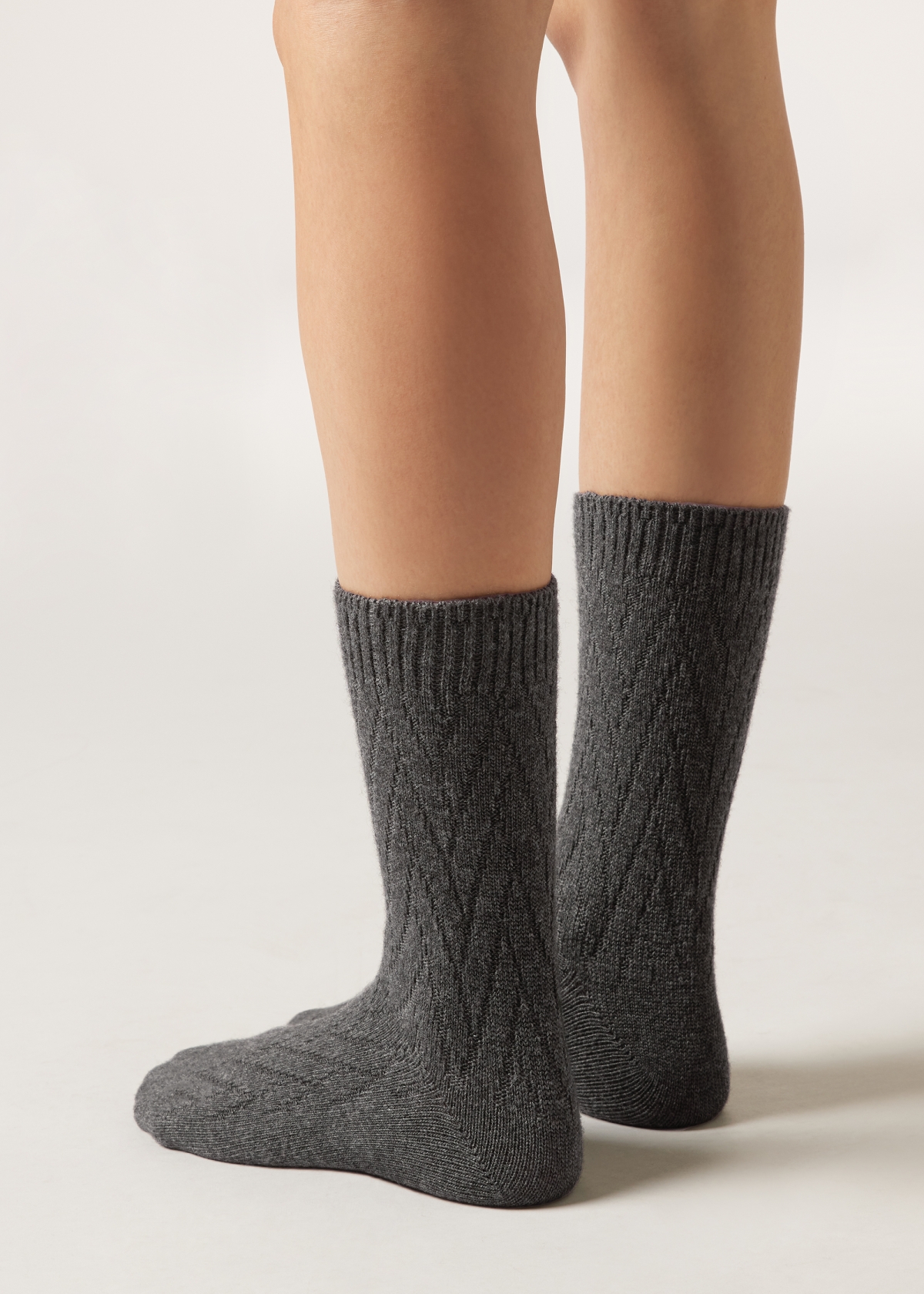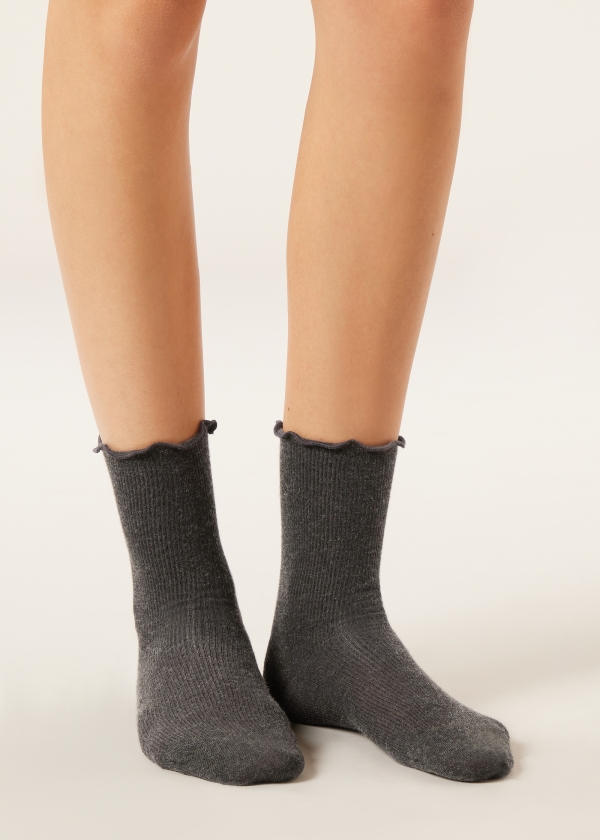 Очень комфортные женские короткие носки из мягкого кашемира и хлопка. Мелкий рубчик придает этой модели изысканный вид и эластичность, а романтичный волнистый бортик — женственность.