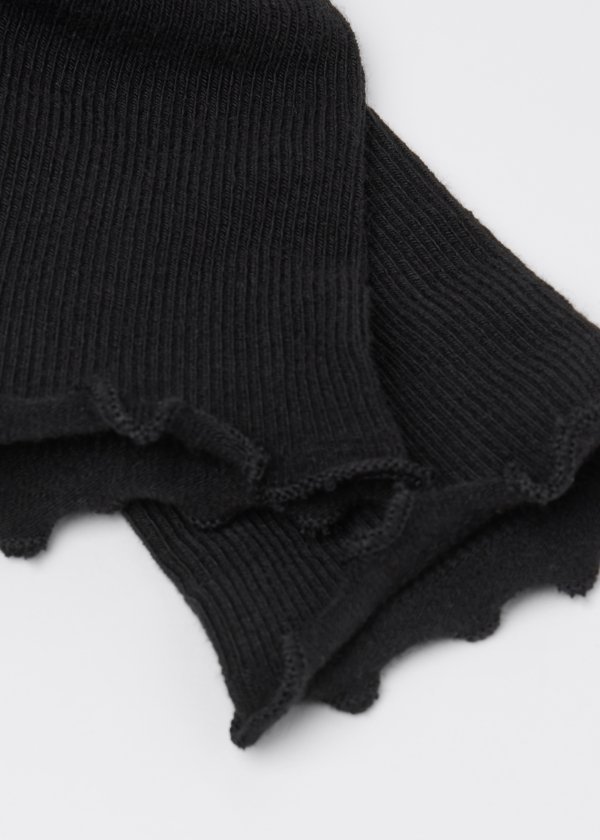 Очень комфортные женские короткие носки из мягкого кашемира и хлопка. Мелкий рубчик придает этой модели изысканный вид и эластичность, а романтичный волнистый бортик — женственность.