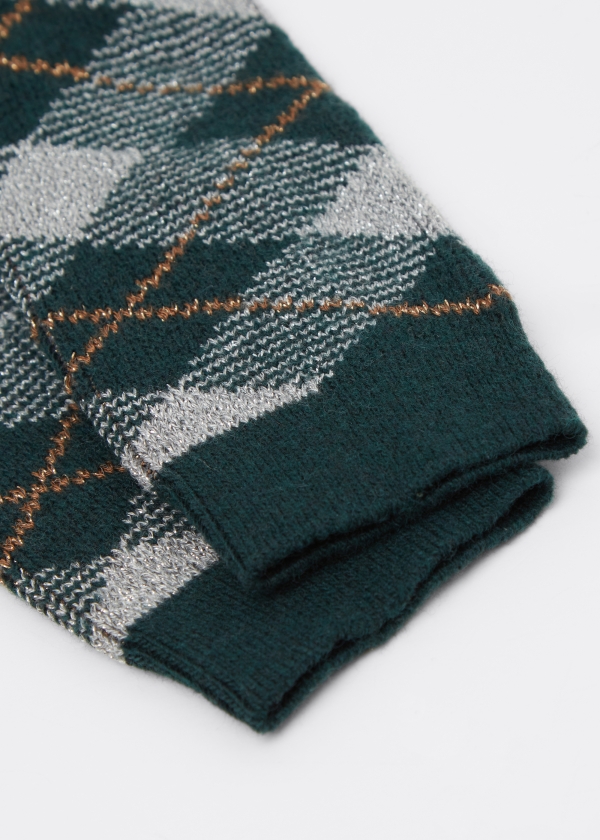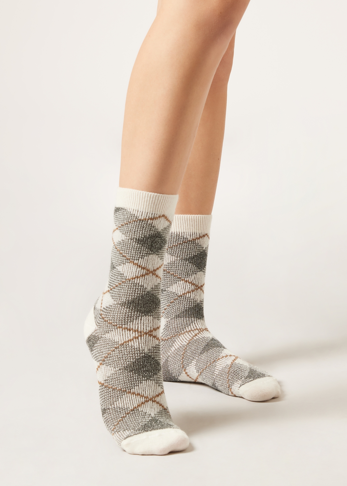 Женские короткие носки из плотной и теплой пряжи с кашемиром. Элегантная модель с узором «тартан» и сияющими блестками.