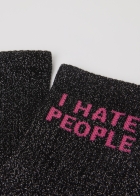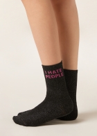 Женские короткие носки из мягкого хлопка, украшенные ироничной надписью с блестками. Этот интересный и яркий аксессуар придаст нотку индивидуальности любому образу.
