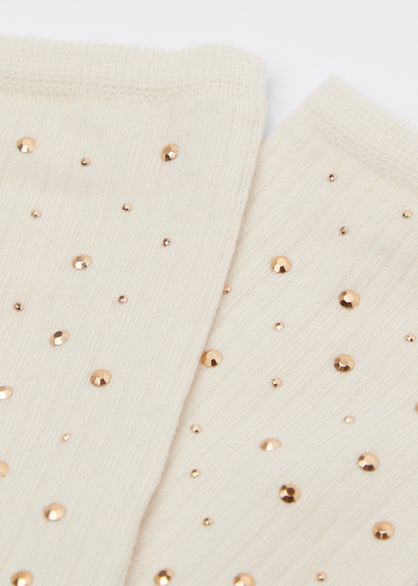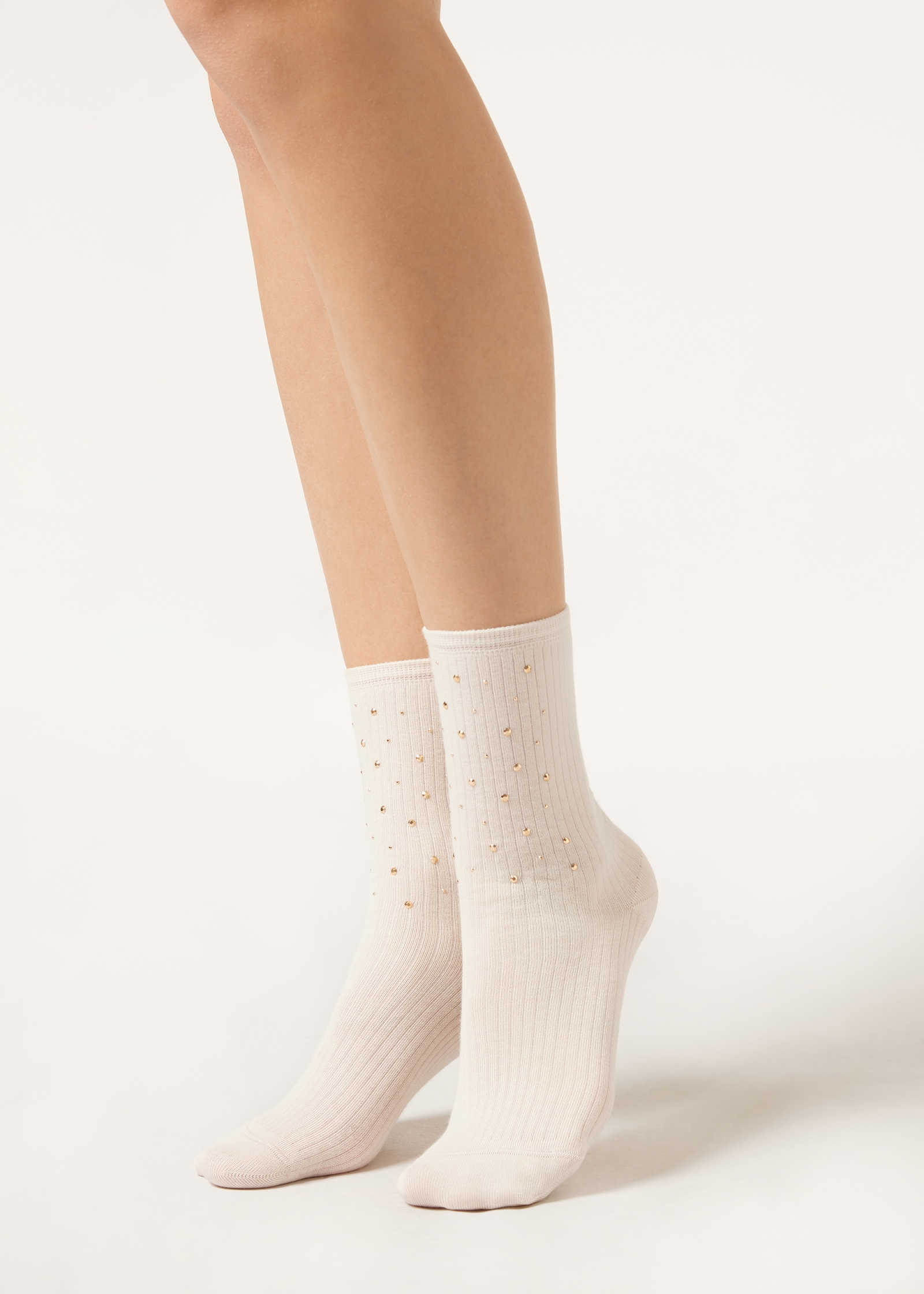 Женские короткие носки из мягкого хлопка в рубчик — идеальное сочетание комфорта и блестящих акцентов. Расположенные спереди заклепки придают изделию особую индивидуальность, внося в образ нотки стиля рок-шик.
