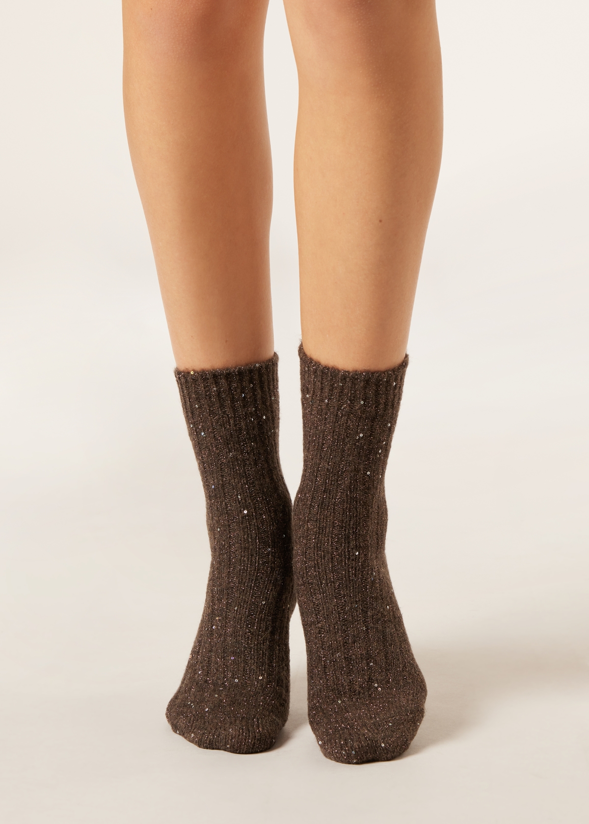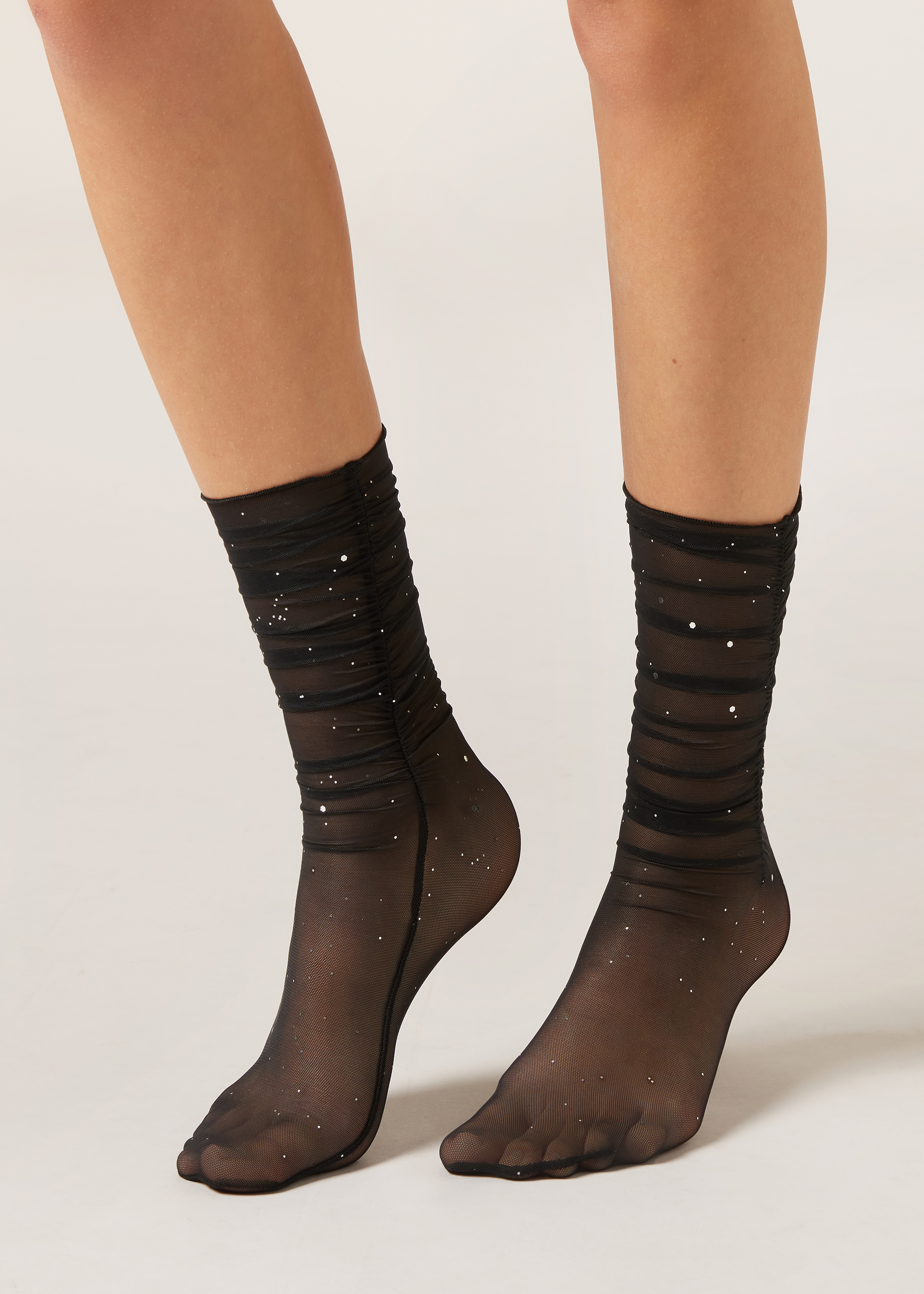 Короткие носки из тюля с блестками. Модель со сборкой по бокам, внешним швом и волнистым бортиком. Эти изысканные искрящиеся носки придадут вашему образу очарование женственности и гламура.