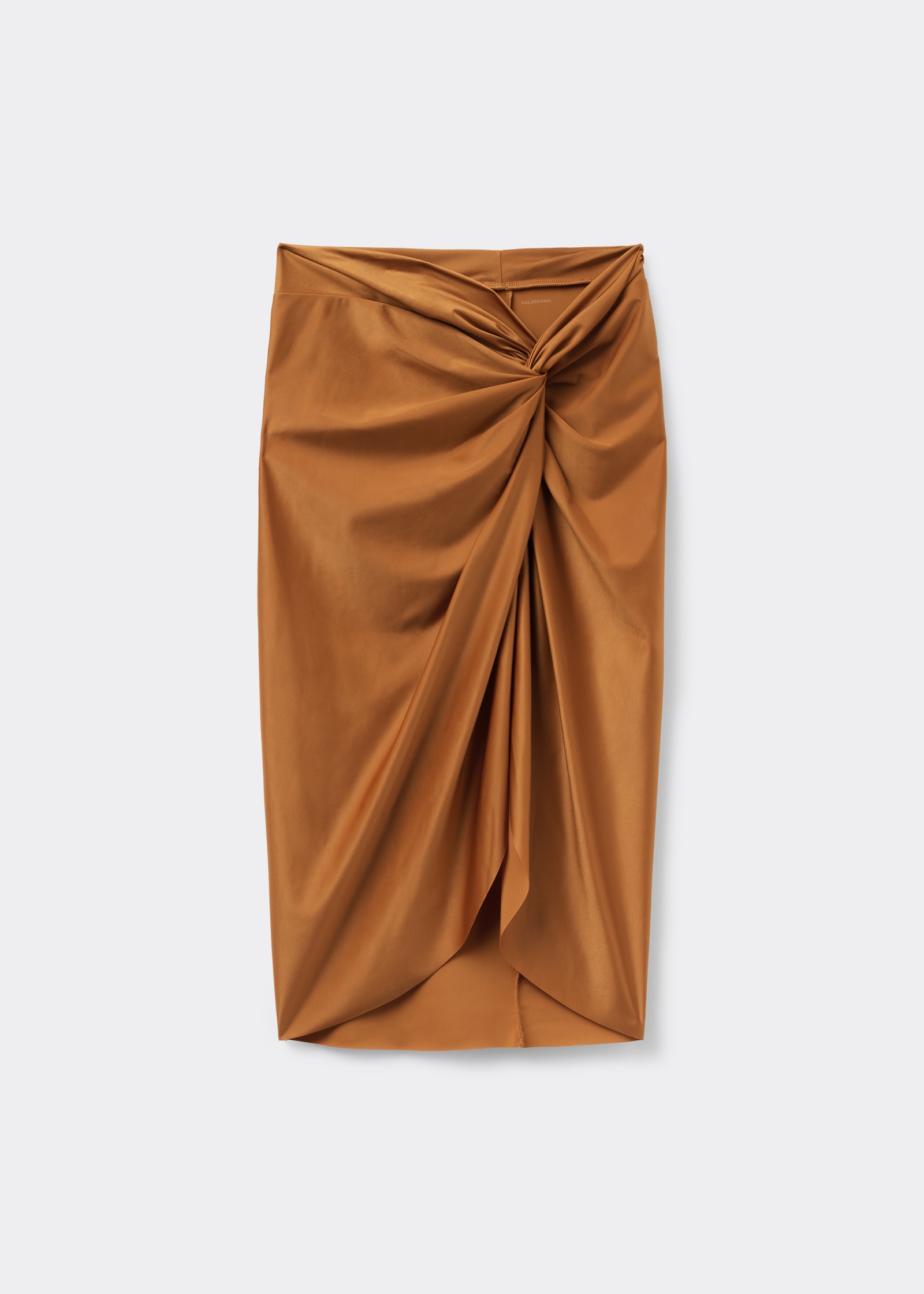 Парео-юбка из легкой блестящей ткани с эффектом шелка создаёт элегантный и утончённый образ. Боковой узел с драпировкой подчёркивает фигуру, идеально подходит поверх купальника или для вечернего наряда.