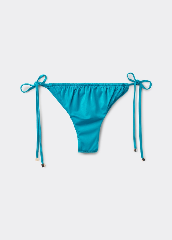 Плавки бразильяно с тонкими боковыми завязками, регулирующими ширину модели. Блестящая ткань с эффектом шелка. Драпировка. Завязки с золотистыми элементами на концах. Сплошная подкладка и невидимые швы.