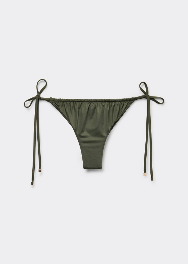 Плавки бразильяно с тонкими боковыми завязками, регулирующими ширину модели. Блестящая ткань с эффектом шелка. Драпировка. Завязки с золотистыми элементами на концах. Сплошная подкладка и невидимые швы.