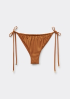 Плавки бразильяно с тонкими боковыми завязками, регулирующими ширину модели. Блестящая ткань с эффектом шелка. Драпировка. Завязки с золотистыми элементами на концах. Сплошная подкладка и невидимые швы.
