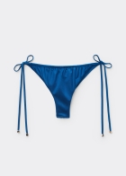 Плавки бразильяно с тонкими боковыми завязками, регулирующими ширину модели. Блестящая ткань с эффектом шелка. Драпировка. Завязки с золотистыми элементами на концах. Сплошная подкладка и невидимые швы.