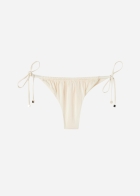 Плавки бразильяно с тонкими боковыми завязками, регулирующими ширину модели. Блестящая ткань с эффектом шелка. Драпировка. Завязки с золотистыми элементами на концах. Сплошная подкладка и невидимые швы.