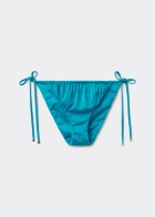 Классические плавки с тонкими боковыми завязками, регулирующими ширину модели. Блестящая ткань с эффектом шелка. Драпировка. Завязки с золотистыми элементами на концах. Сплошная подкладка и невидимые швы.