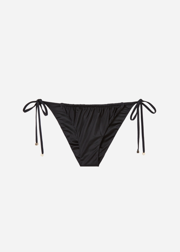 Классические плавки с тонкими боковыми завязками, регулирующими ширину модели. Блестящая ткань с эффектом шелка. Драпировка. Завязки с золотистыми элементами на концах. Сплошная подкладка и невидимые швы.