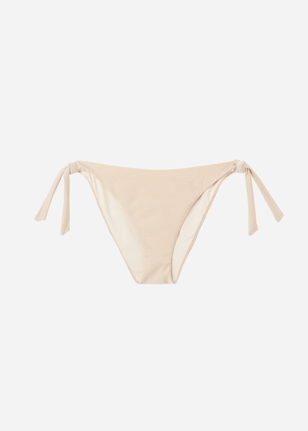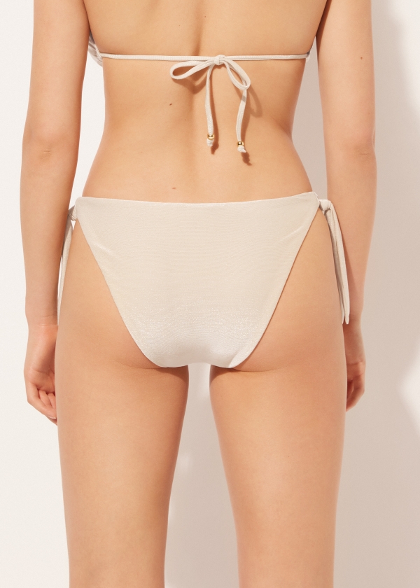 Классические плавки с боковыми завязками, регулирующими ширину модели. Изделие выполнено из мягкой ткани с блестящей нитью ламе. Сплошная подкладка.